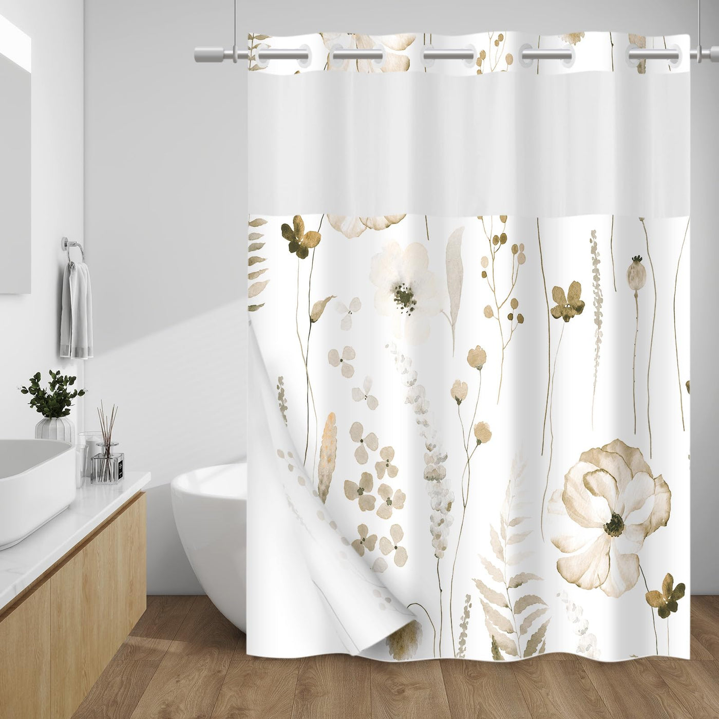 Withloc No Hook Shower Curtain With Snap In Liner - Floral Shower Curtain - Fabric Waterproof Inner Liner, Plants Watercolor Bei