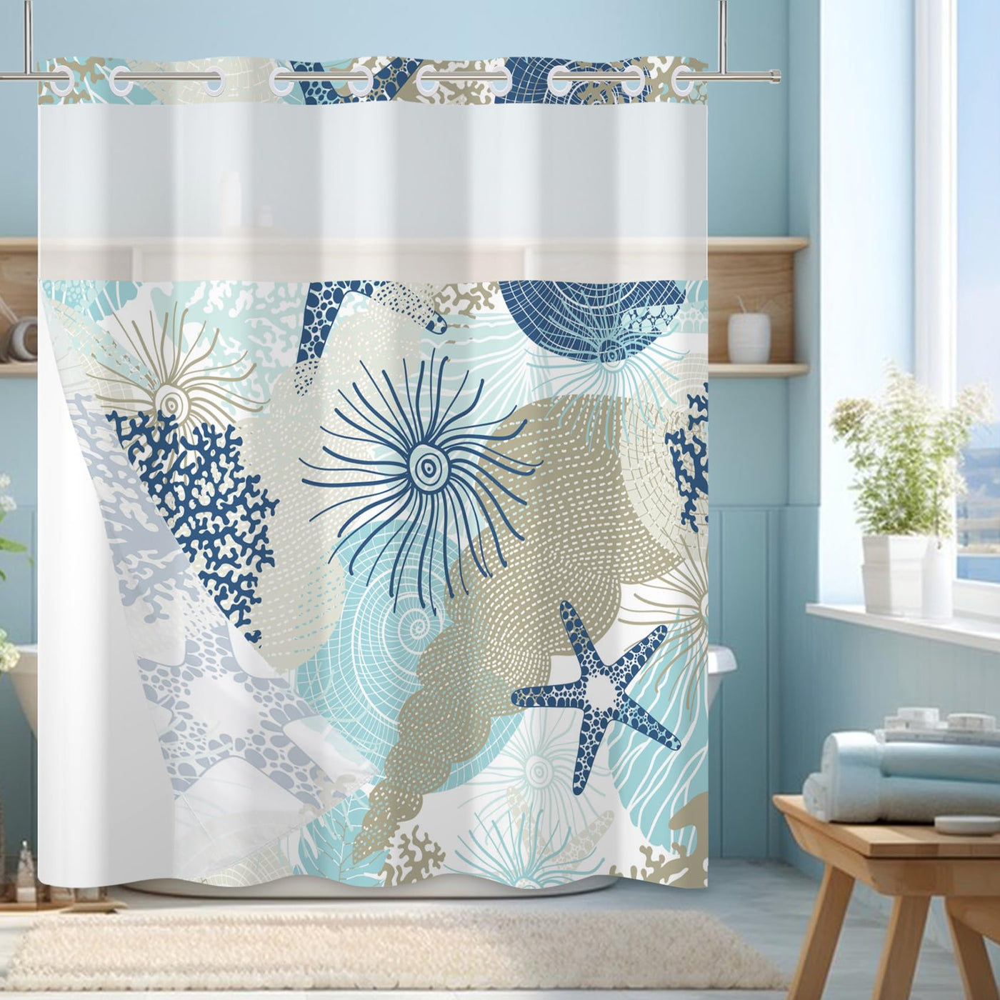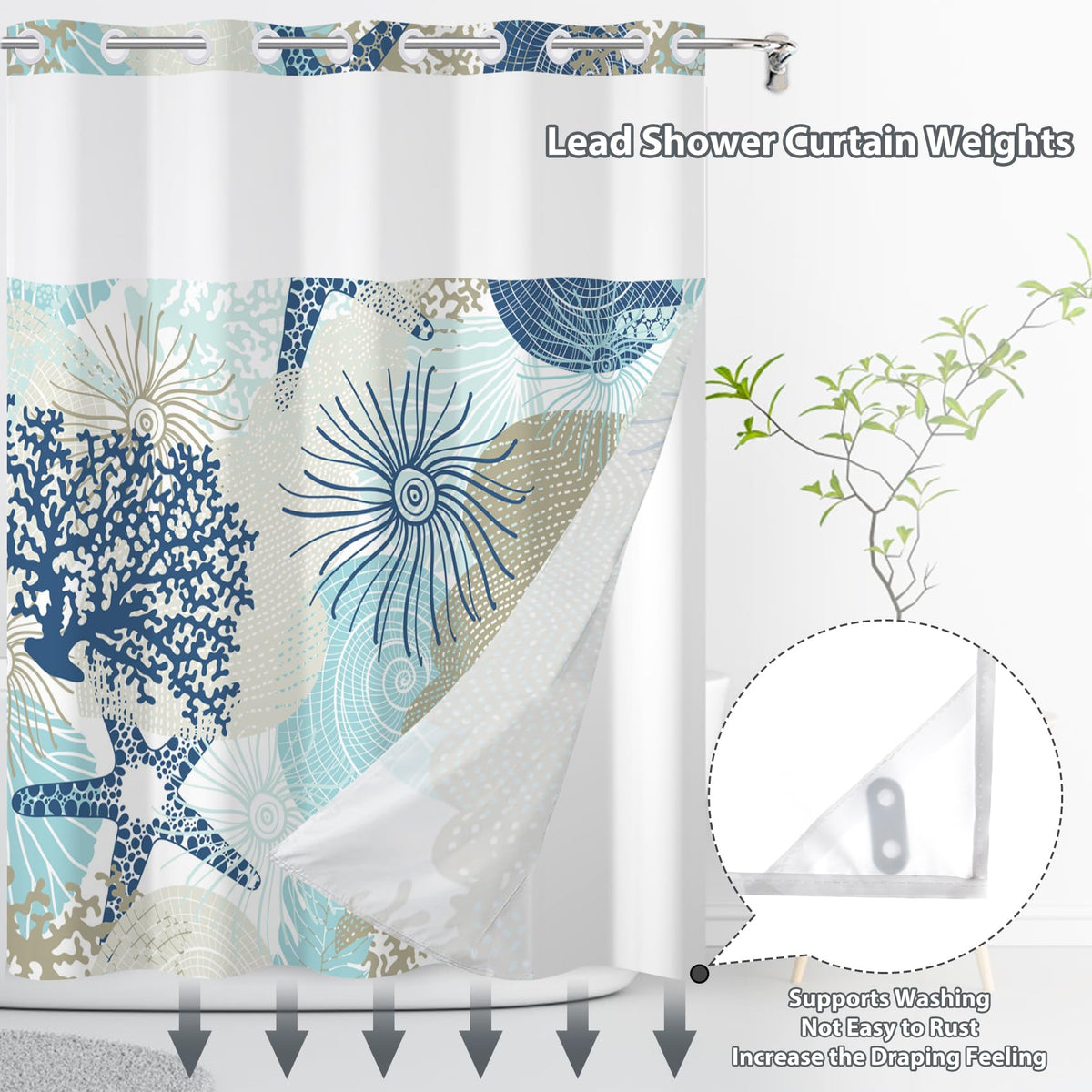 Yanutan No Hook Shower Curtain,Blue Ocean Double-Layered Shower Curtain With Snap-In Liner And Weights,Starfish Coral Nautical C
