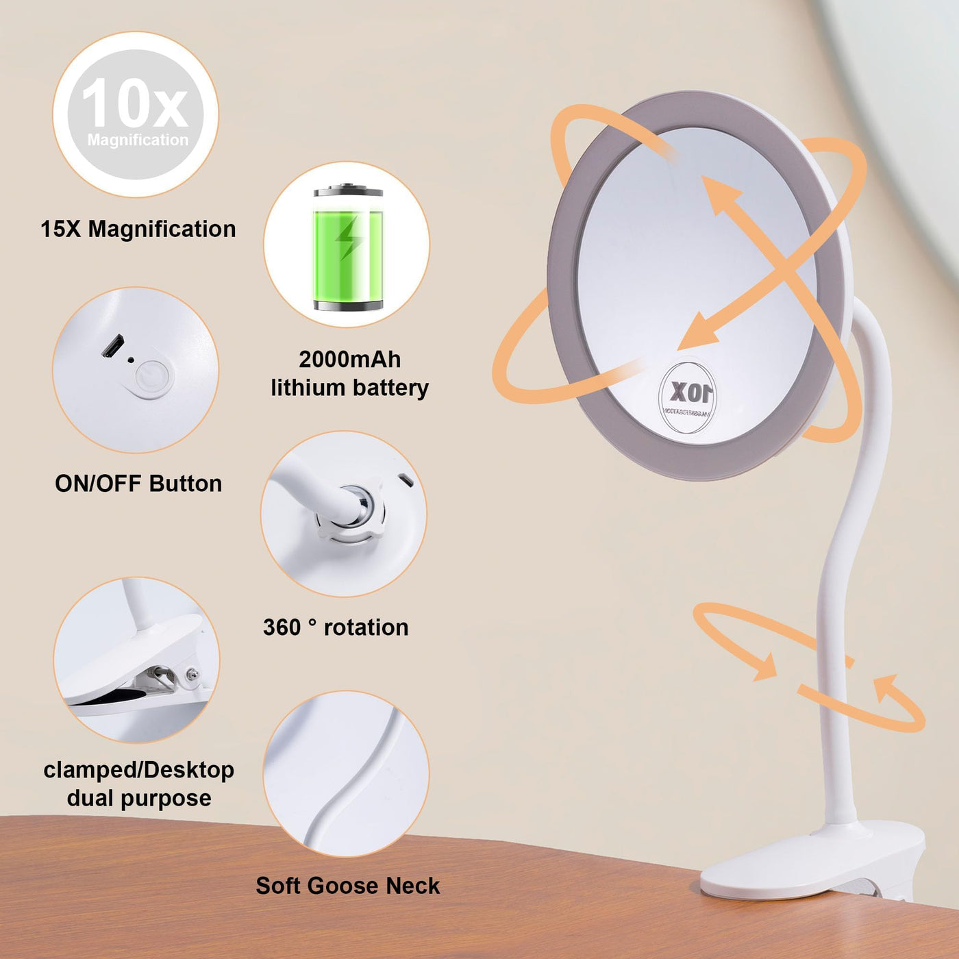 6.5'' Clip On Magnifying Vanity Mirror With Light, 5X Magnifying Clip-On Gooseneck Vanity Mirror, 2000Mah Usb Magnifying Mirror