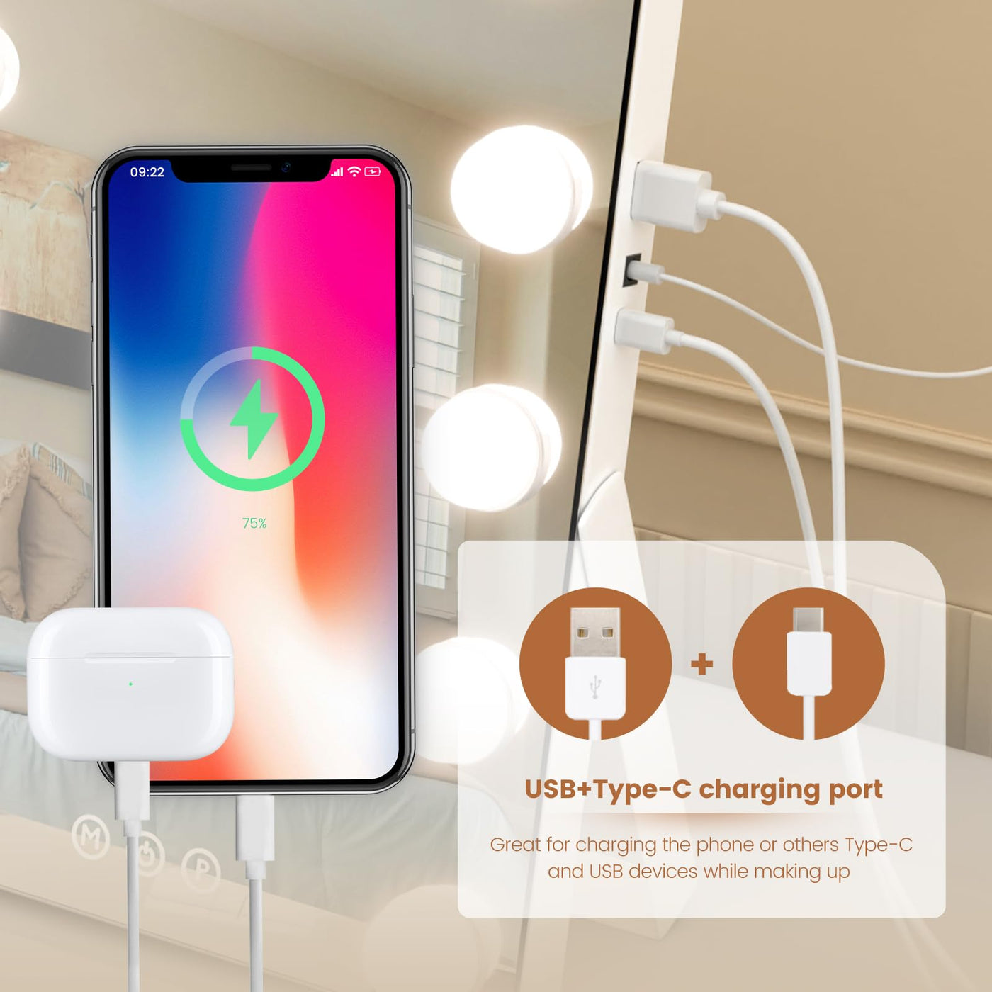 - Q: What kind of charging ports does this mirror have? A: The mirror is equipped with both USB and Type-C charging ports, allowing you to charge your devices conveniently.