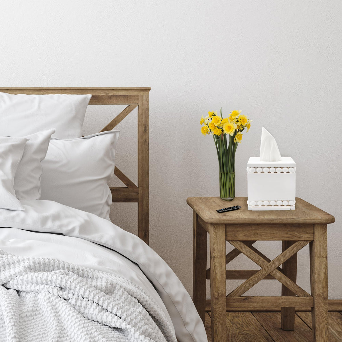 Auldhome Design Beaded Square Tissue Box Cover (White); Rustic Farmhouse Wood Tissue Holder
