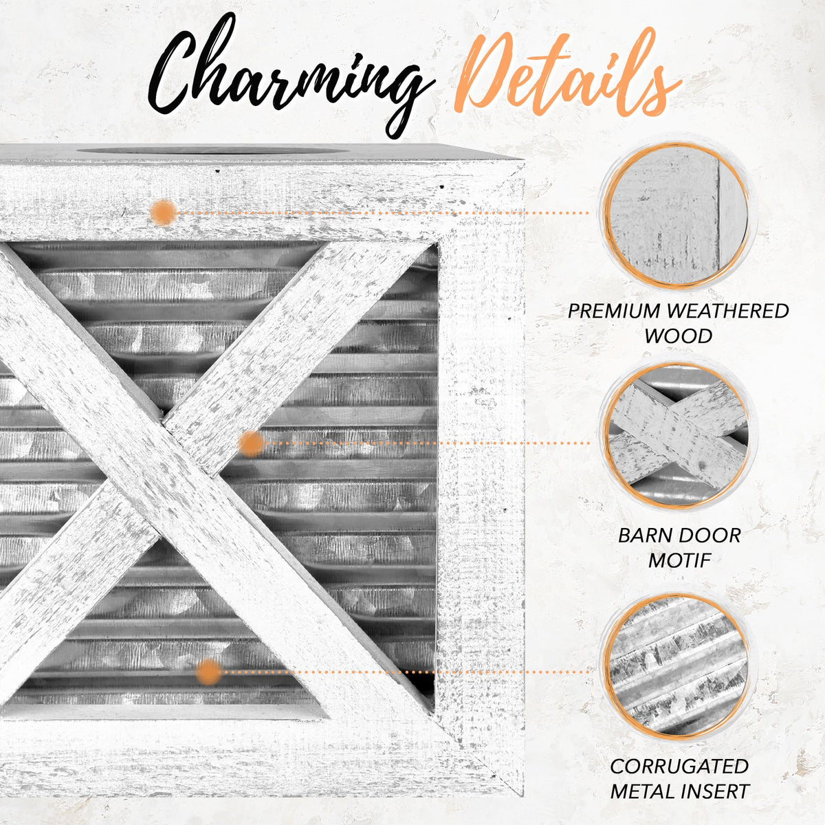 - Q: What materials are used in the Autumn Alley Barn Door Tissue Box Cover? A: The tissue box cover is made from premium REAL wood, corrugated aged galvanized metal, and black metal, ensuring durability and a rustic aesthetic.
