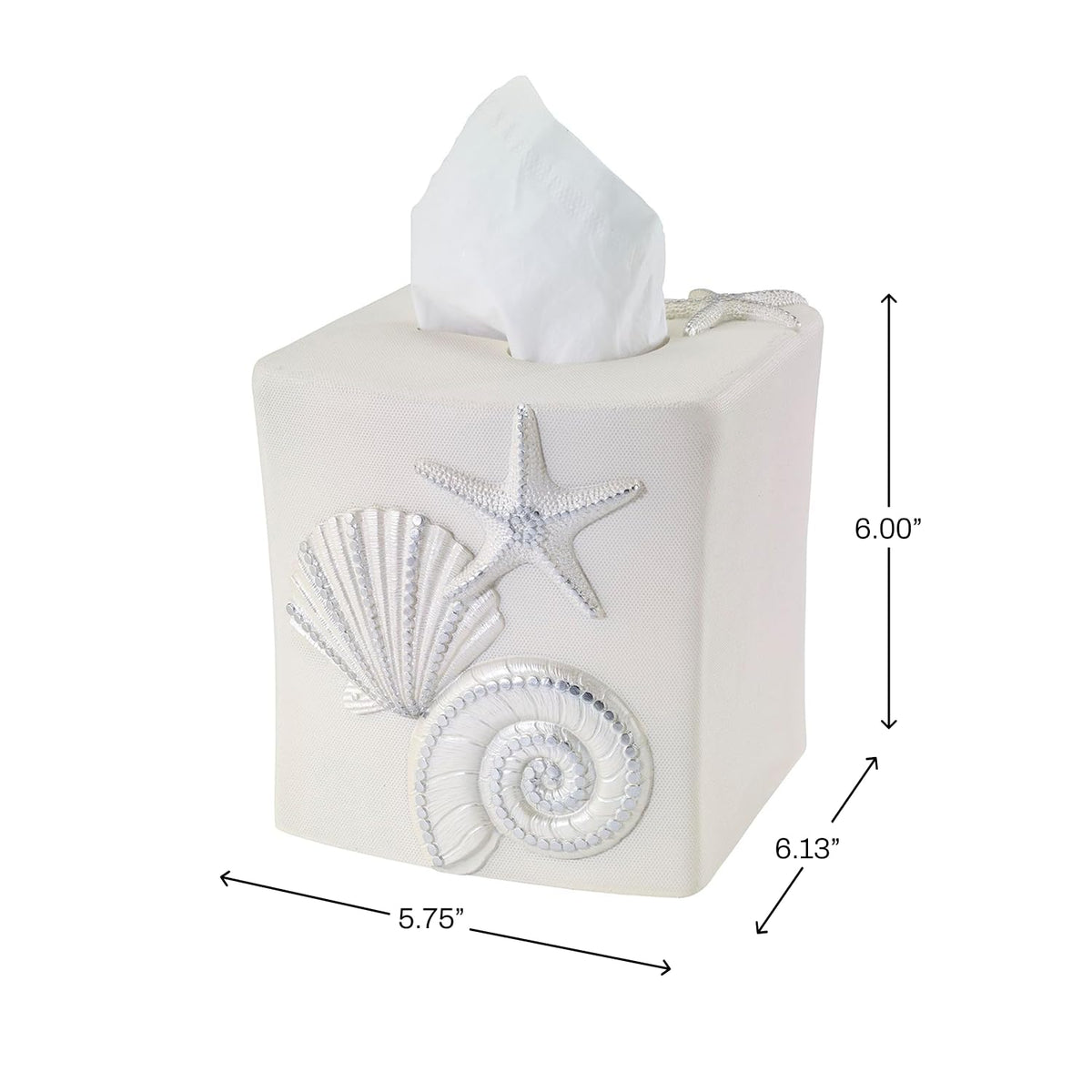 - Q: What design features does the tissue box cover have? A: The tissue box cover features a beautiful design inspired by coastal themes, specifically with a sequin shells motif.