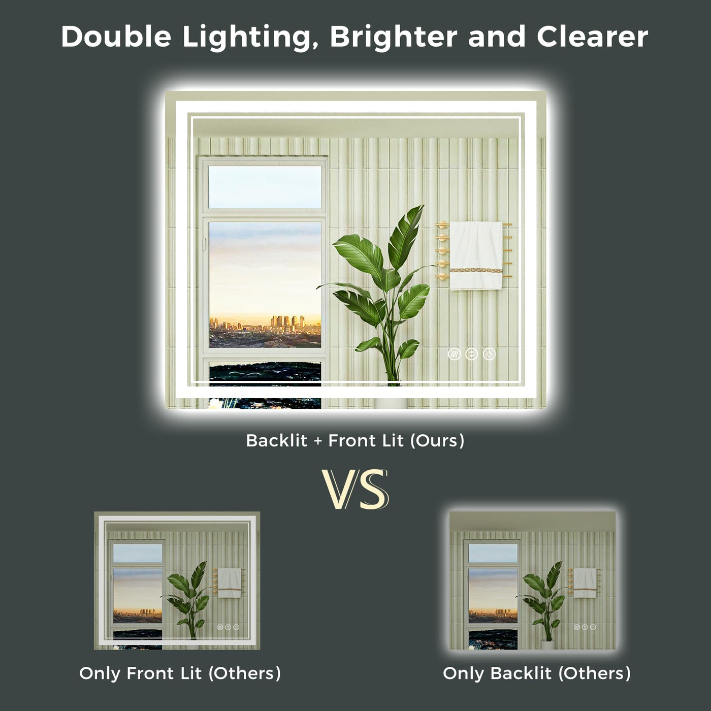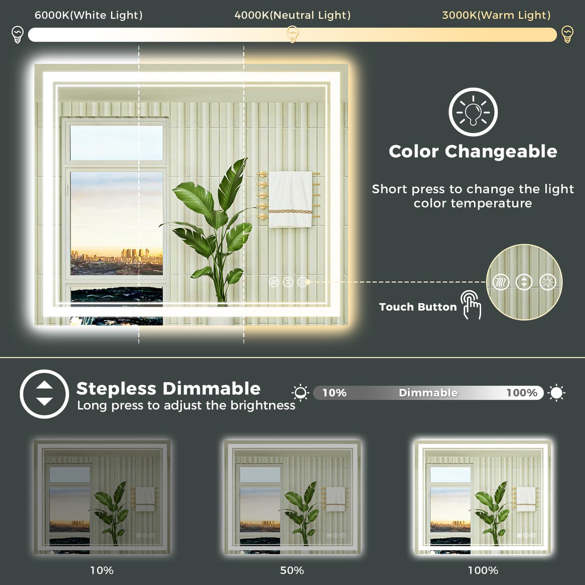 • Q: Can the brightness of the lights be adjusted? A: Yes, the mirror features a dimmable function. You can long-press the 'Dimmer' button to adjust the brightness from 100% down to 10% to suit your preference.