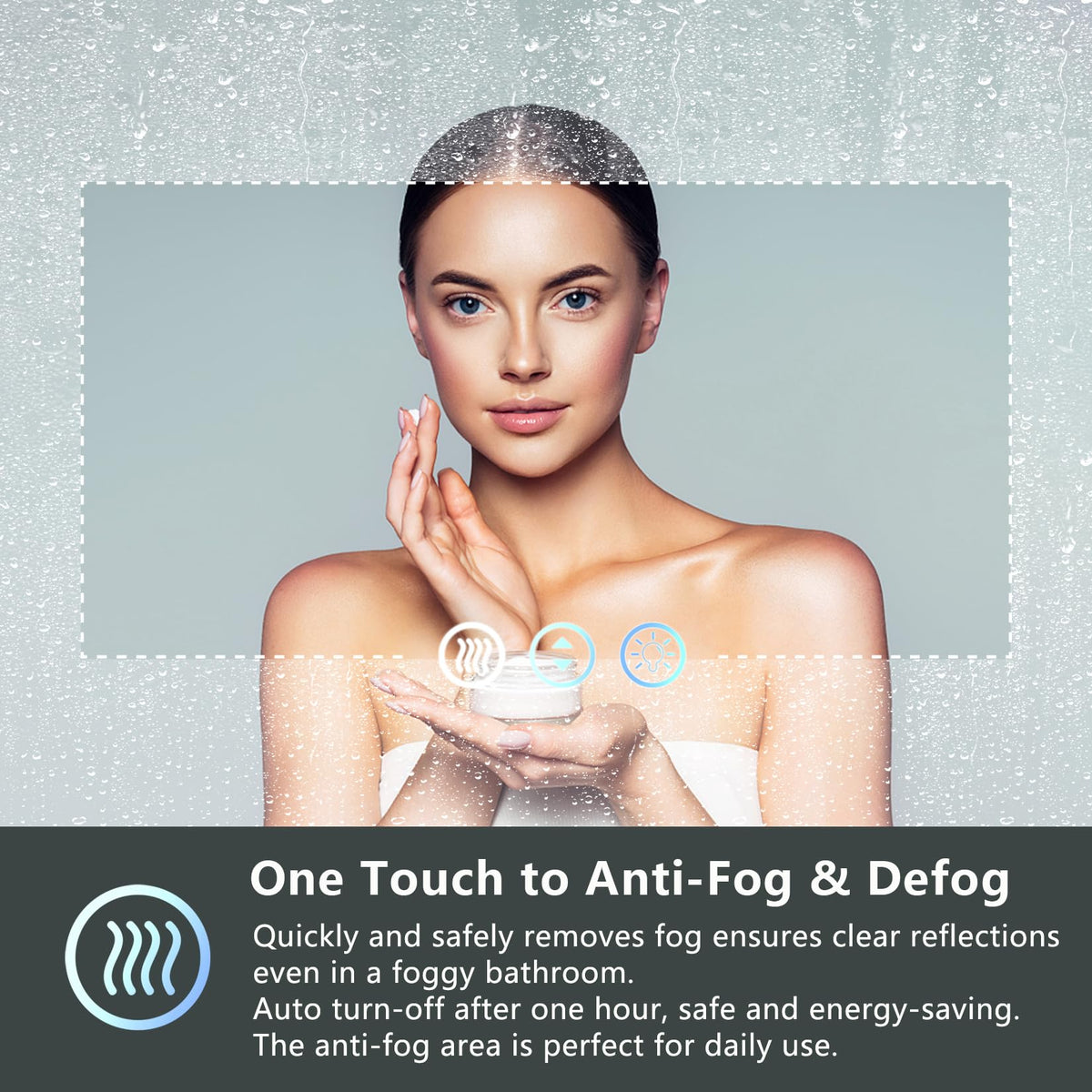 • Q: How does the anti-fog function work on this mirror? A: The anti-fog function uses a heating element to prevent fogging. Activate it before your shower to maintain a clear reflection, and it will automatically turn off after one hour.