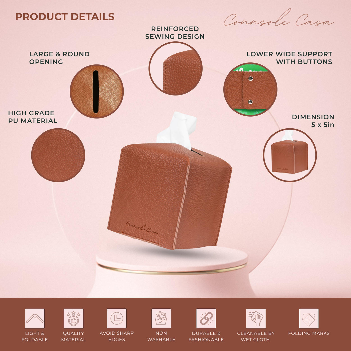 - Q: What material is the tissue box cover made from? A: The Connsole Casa tissue box holder is made from high-quality PU leather, offering both elegance and durability.