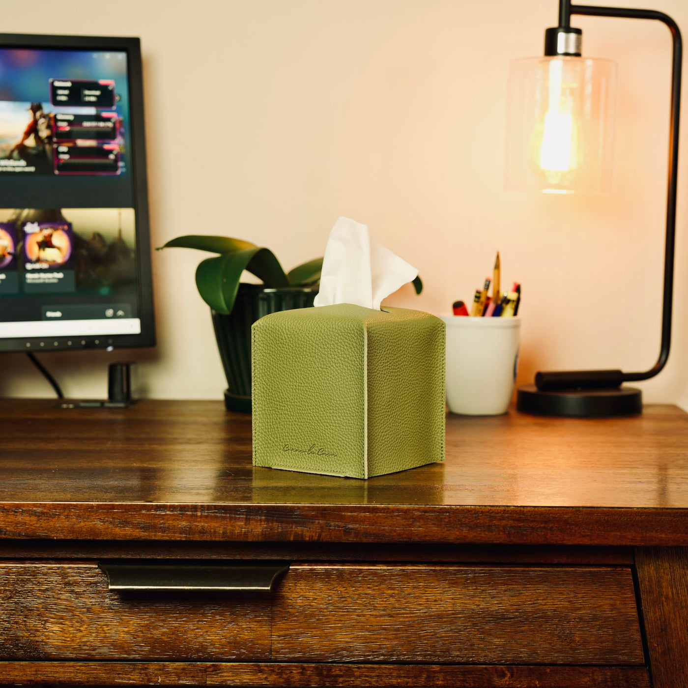 Connsole Casa Premium Pu Leather Tissue Box Holder - Elegant Hotel-Style Green Tissue Box Cover For Enhanced D Cor Of Home, Off