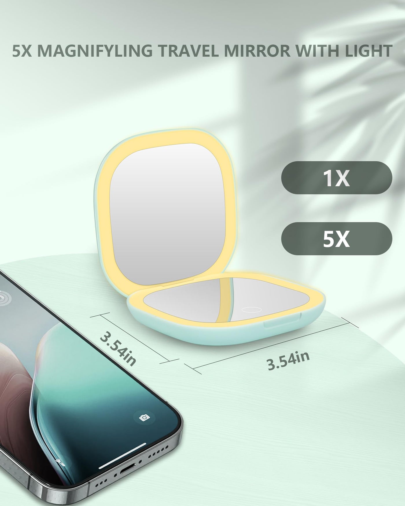 Dec.Metu Compact Mirror, 1X/5X Magnification Pocket Travel Makeup Mirror With Lights For Purse Rechargeable Small Handheld Mirro