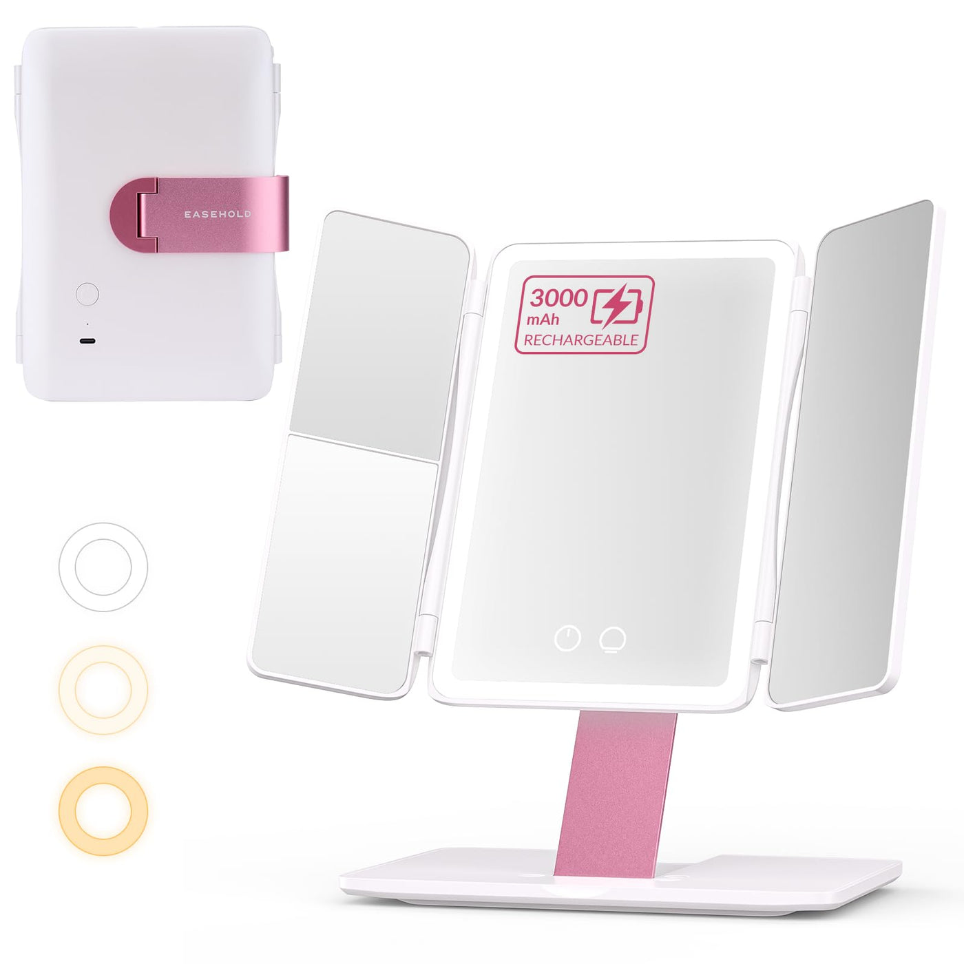 Elevate your beauty routine with the EASEHOLD Foldable Tri-Fold Lighted Makeup Vanity Mirror, a versatile essential that blends functionality and elegance for every makeup enthusiast. Whether youre prepping at home, touching up on a trip, or organizing your dorm room, this mirror is designed to meet all your needs. Crafted with a smart tri-fold design, this makeup mirror with lights offers exceptional flexibility. Its 360 swivel and 90 multi-angle rotation let you adjust to any angle effortlessly, ensuring you never miss a detail while applying foundation, eyeliner, or mascara. When folded, it transforms into a compact mirror, saving space on your vanity, desk, or suitcase-making it the perfect travel mirror for jet-setters or dorm dwellers. Its more than just a mirror; its a dorm room essential for girls, a handy bathroom accessory, and a stylish addition to your bedroom decor. Illuminate your beauty with 60 eye-friendly LED lights, far more than the typical 21 found in most mirrors. This lighted makeup mirror with magnification lets you choose between cool, natural, or warm light to match any environment, whether youre getting ready for a morning class or a night out. The smart touch control makes dimming a breeze, and the memory function saves your preferred setting, so you can step into your routine seamlessly every time. Precision is key, and with 1X, 2X, and 3X HD magnification, this magnifying mirror with light has you covered. Use the 1X mirror for full-face makeup, then switch to 2X or 3X for intricate tasks like shaping brows, applying false lashes, or inserting contact lenses. The distortion-free glass ensures clarity, making it a must-have for flawless beauty routines. Say goodbye to constant battery changes. Equipped with a 3000mAh rechargeable battery and a Type-C charging cable, this led mirror offers up to 10 days of use per charge (depending on brightness). It also supports USB continuous power, so you can use it while charging-ideal for long trips or extended use. Built to last, this vanity mirror features corrosion-resistant metal brackets and scratch-proof ABS, with a chic rose gold frame and white body that adds a touch of sophistication to any space. Its not just a tool; its a thoughtful gift. Whether youre searching for birthday gifts for women, Christmas gifts for mom, or trendy teen girl gifts, this mirror combines practicality and style, making it perfect for any occasion. From home essentials to travel must-haves, the EASEHOLD Lighted Makeup Mirror is more than a mirror-its a beauty companion that adapts to your lifestyle.