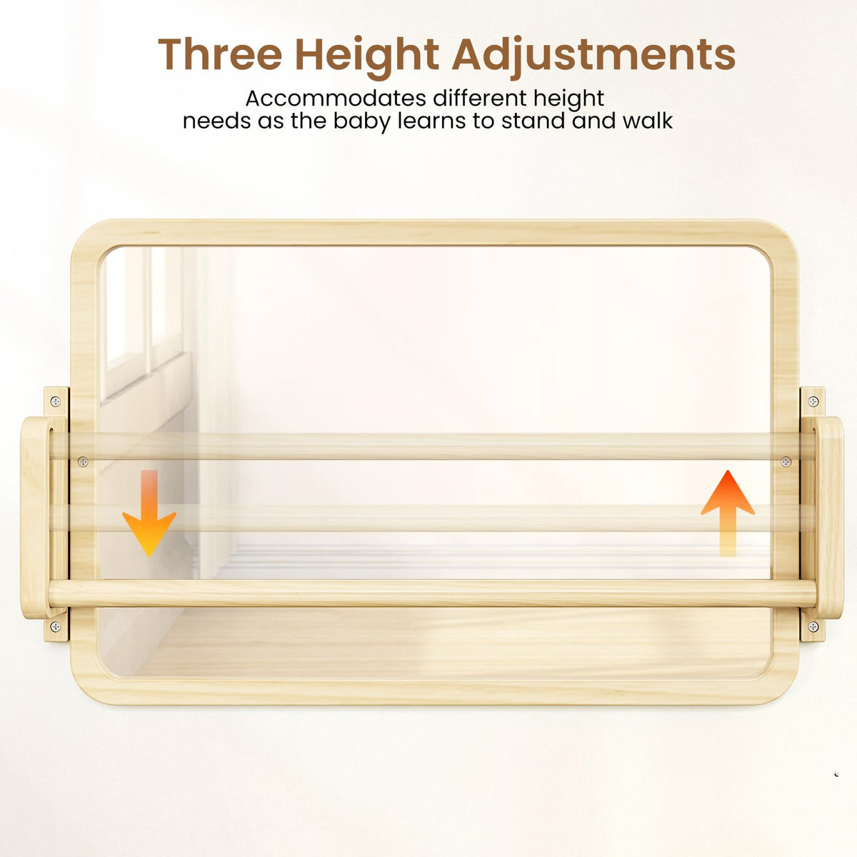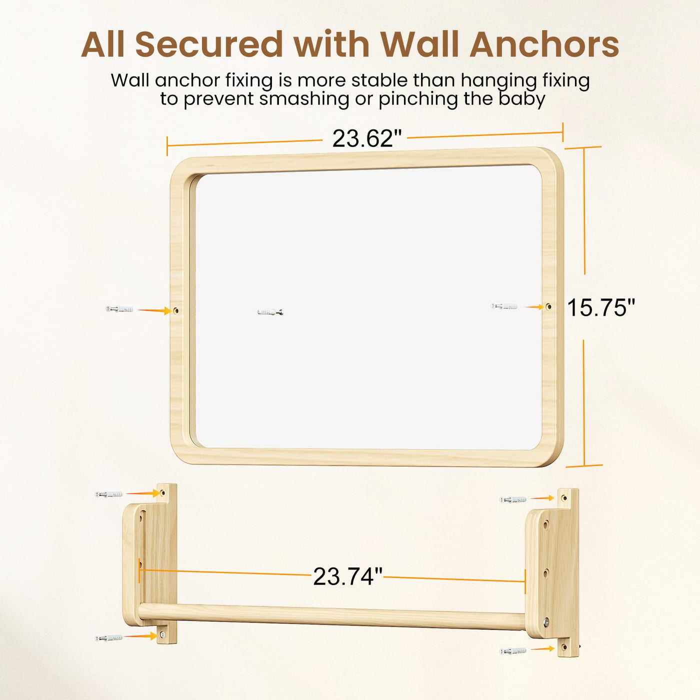 Woodtoe Montessori Baby Mirror with Bar Shatterproof Safety Mirror with Pull Up Bar for Infant 6-18 Months Lay flat on the floor mode for crawling babies to promote motor skills in their tummy time; mount horizontally on walls mode for baby learning to stand in their exploring time; stand vertically for older kids to build self-awareness, independence, and social skills during dressing/play. Our baby pull up toy adapts to every developmental stage with your child. Our baby pull up mirror is designed to captivate your babys curiosity. With three height settings, our toddler mirror adapts to your childs growth from standing to walking. This feature ensures optimal use and support at every developmental stage, making it a versatile and long-lasting addition to your home. Specification: The size of baby walking mirror: 23.62 x 15.75 x 08 inches Package Include: 1 x Montessori mirror with pull up bar 1 x Hardware accessories 1 x Product instruction