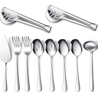 - Q: What sizes do the serving utensils come in? A: The set includes various sizes: 2 x 8.5 inch serving spoons, 2 x 8.8 inch serving forks, 2 x 9.5 inch serving tongs, 2 x 8.6 inch slotted serving spoons, 1 x 9 inch pie server, and 1 x 8.5 inch soup ladle.