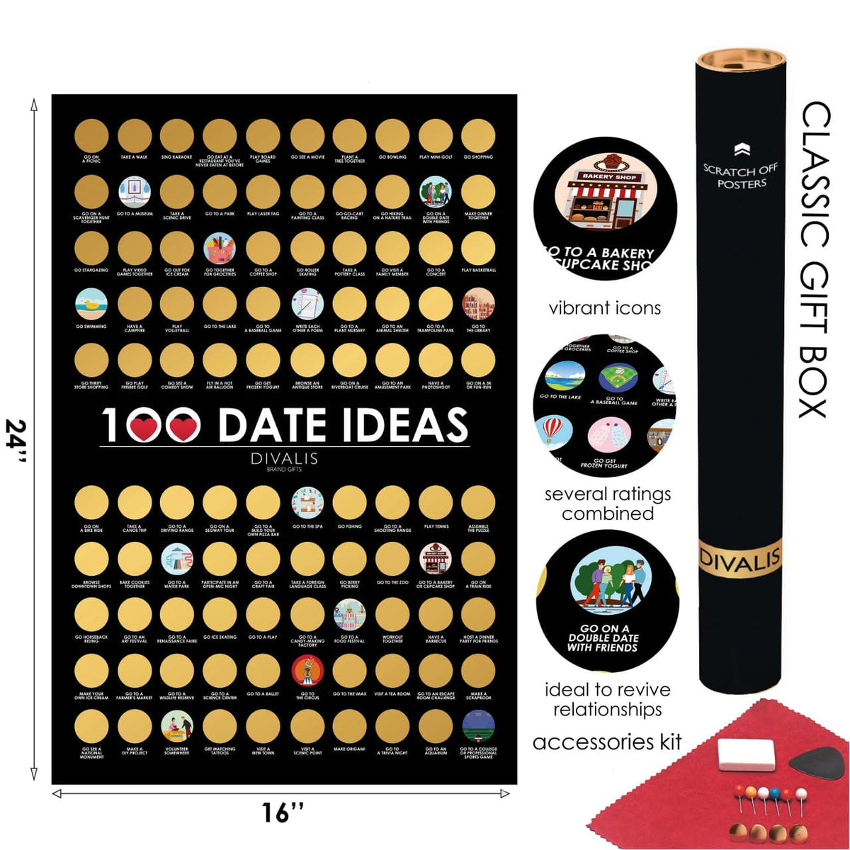- Q: What is the size of the Divalis 100 Dates Scratch-off Bucket List poster? A: The Divalis poster measures 24x16 inches, making it ideal for displaying activities and easy to frame for décor.