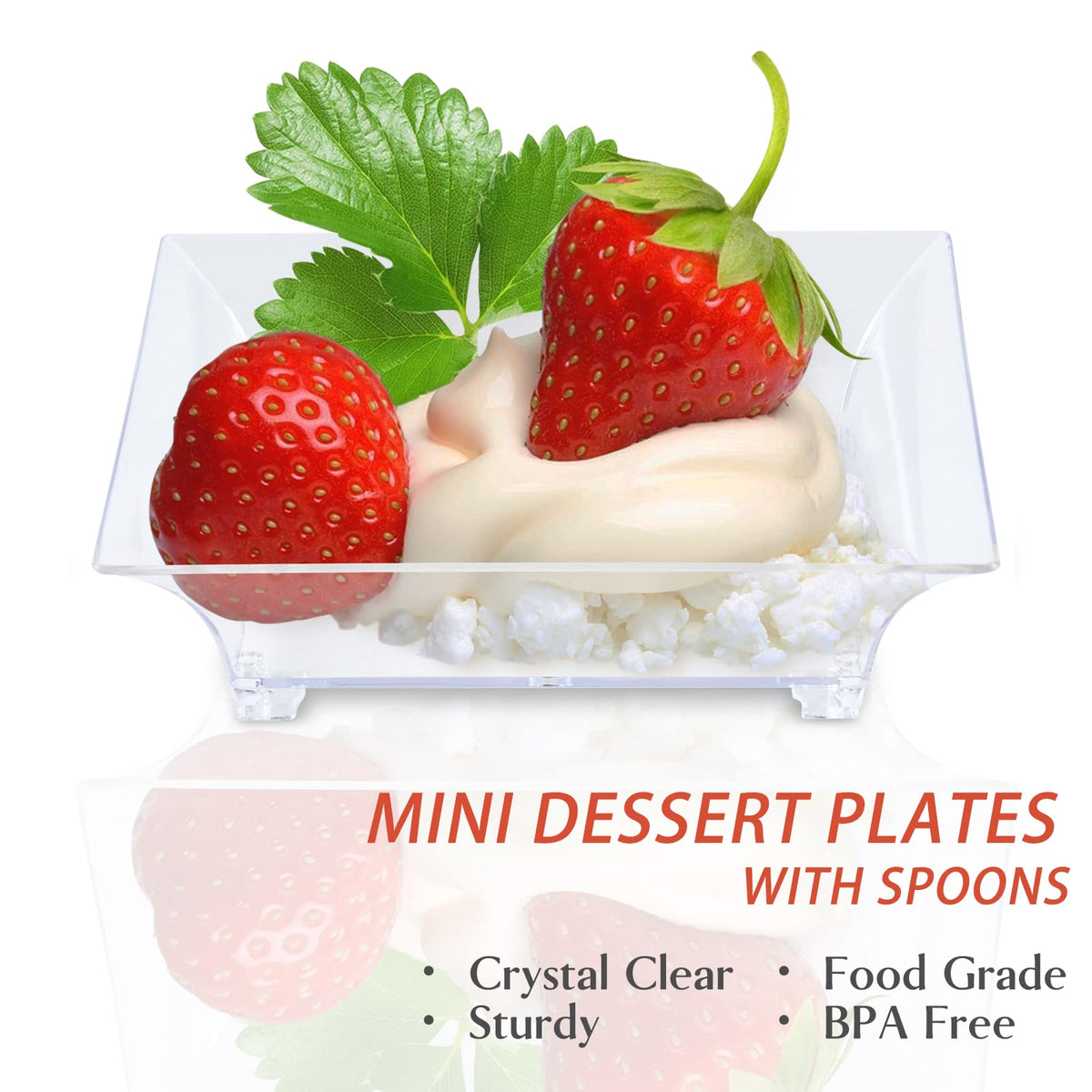 - Q: How many plates and spoons are included in the pack? A: The pack includes 100 mini plastic dessert plates and 100 clear spoons, providing great value for parties or commercial use.