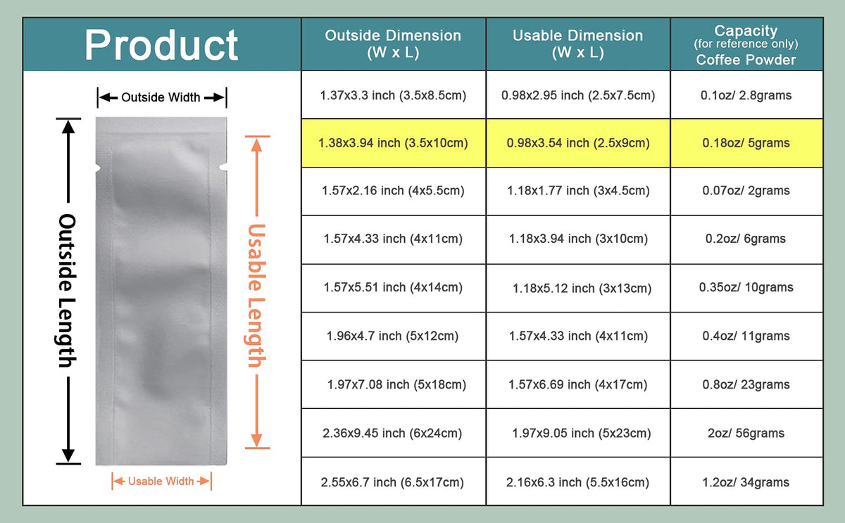 - Q: What are the dimensions of the coffee storage bags? A: The coffee storage bags measure 1.38 inches by 3.94 inches.