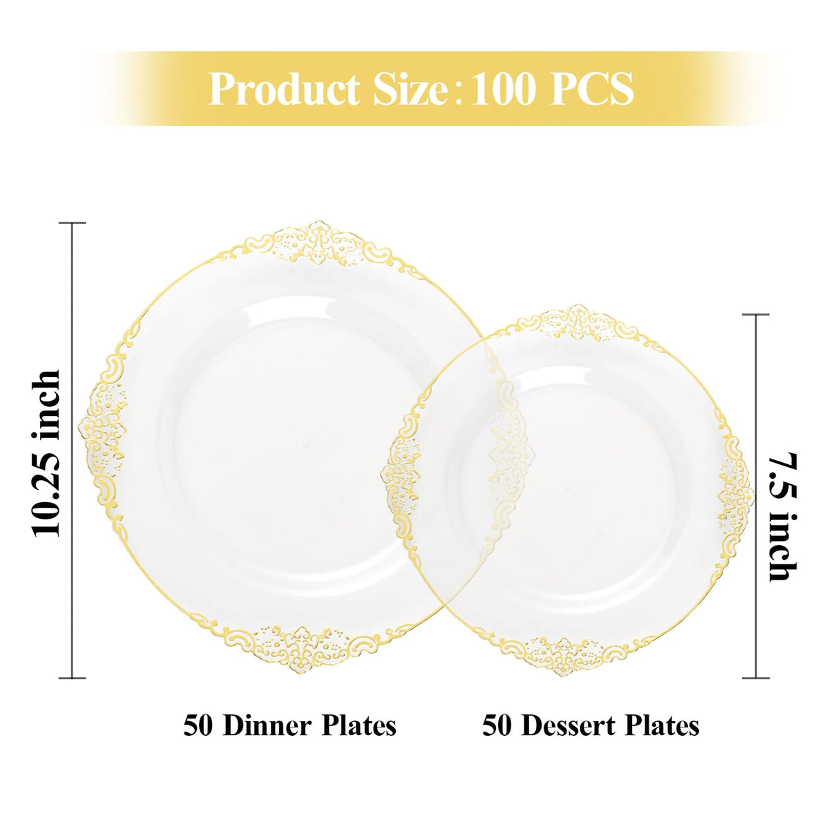 100 Pcs Clear And Gold Plastic Plates For 50 Guests, Clear Disposable Plates Include 50 Pcs Dinner Plates, 50 Pcs Dessert Plates