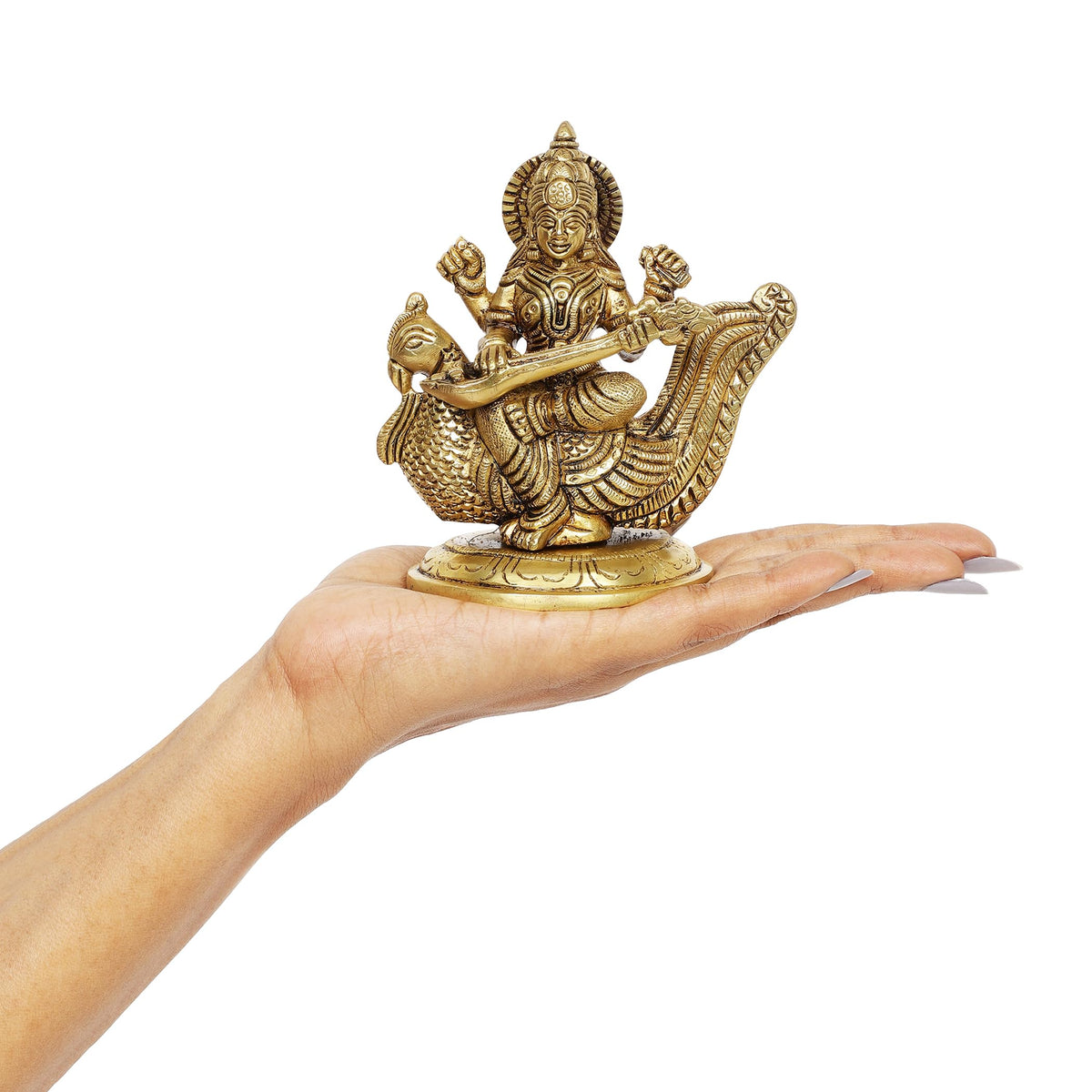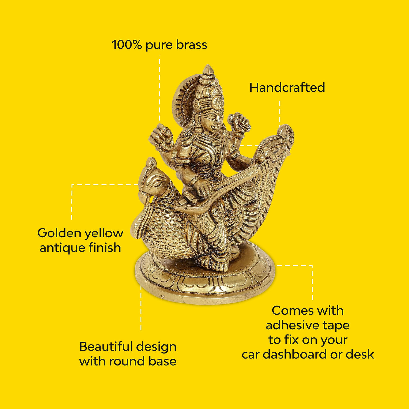 10Club Goddess Saraswati Idol - 1Pc (11.5 cm, 850 Grams) - 100% Pure Brass | Saraswati Sitting on a Peacock for Desk, Pooja, Hom