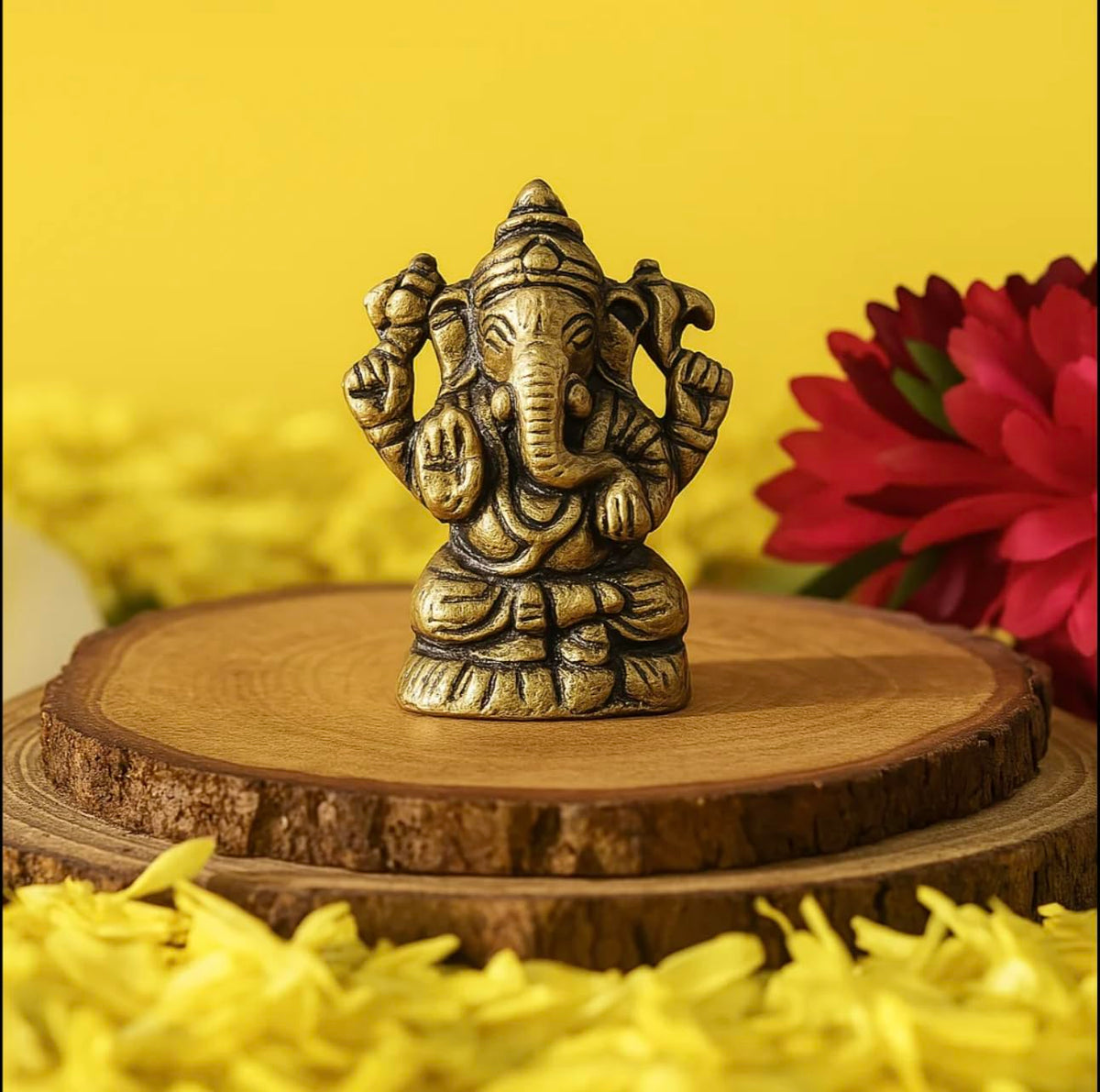 10Club Lord Ganesha Idol - 1Pc - 100% Pure Brass | Ganesh Unique Design with a Round Base for Desk, Car, and Home Dcor | Yellow