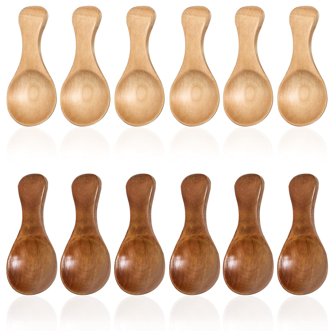 - Q: How many spoons come in a package? A: The package includes a total of 12 small wooden spoons, with 6 in a light color and 6 in a dark color.