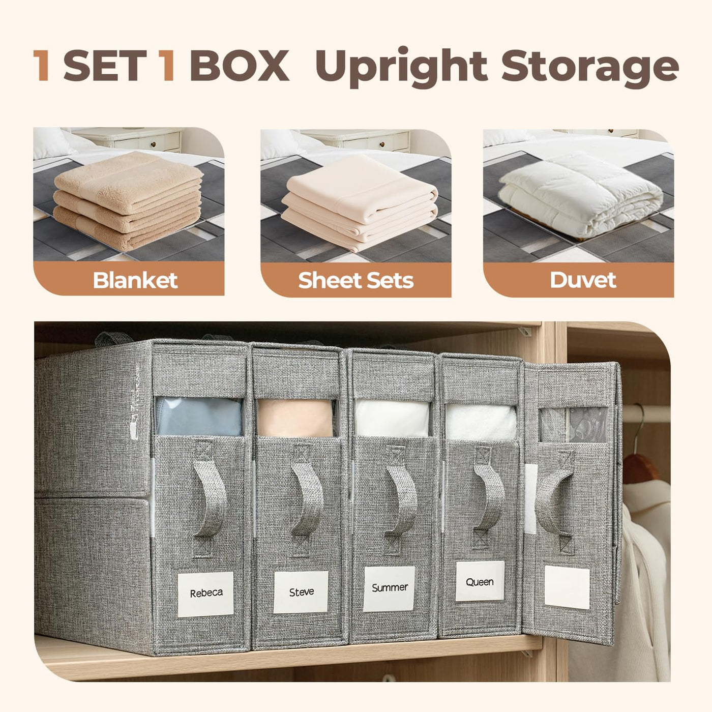 Transform Closet Chaos into Calm Effortlessly organize bedding with our space-saving sheet organizers. Designed for detail-oriented households, this system brings permanent order to linen storage challenges. ? Visible & Labeled Organization Dual clear windows + removable labels instantly identify sets like King Cotton or Guest Room Flannel. No more rummaging - sheet organizers for linen closet make selection instant. ? Dustproof Seasonal Protection 3-layer fabric (linen/cardboard/non-woven) blocks dust, pet hair, and humidity. Ideal for storing king sheet storage sets or seasonal blankets with confidence. ? King-Size Capacity (15.16L x 12.99W x 4.65H) Holds full bedding sets: 1 flat sheet + 1 fitted sheet + 2 pillowcases. Doubles as multifunctional storage for duvet covers, towels, or kids toys. ? Durable & Ready-to-Go Reinforced handles + smooth zippers withstand frequent access. Sturdy linen organizers maintain shape even when fully loaded. ? Space-Adaptive Design Collapses thinner than a phone for under bed storage or narrow shelves. Sets up in seconds: fold ? insert ? zip.