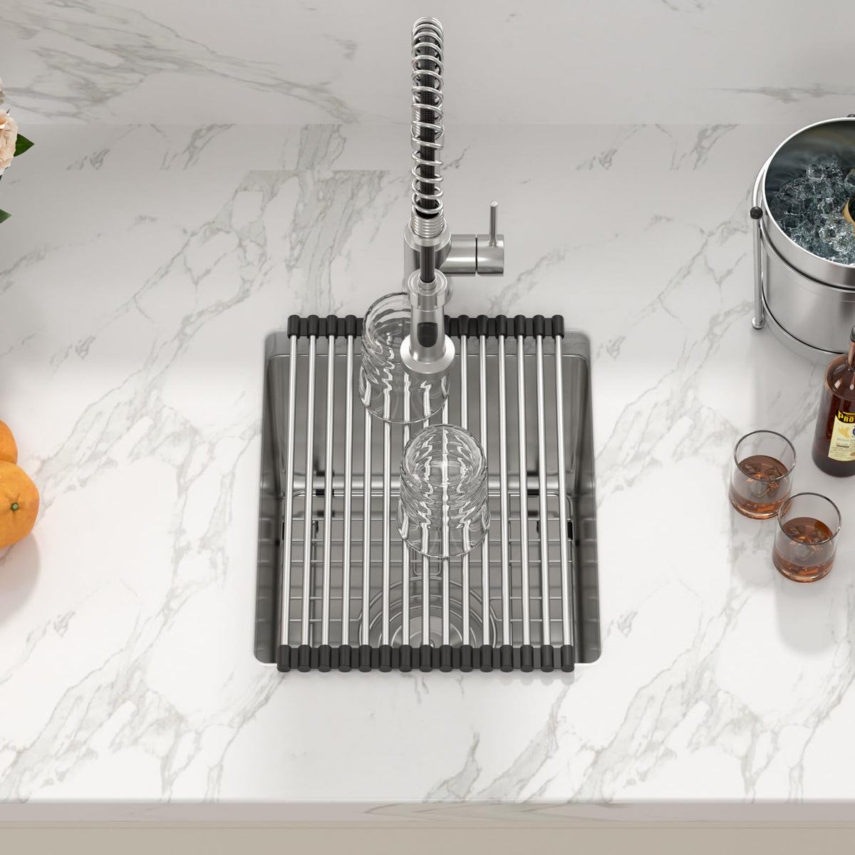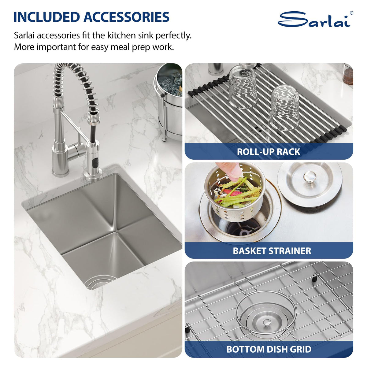 • Q: What is included in the package with the sink? A: The package includes the bar prep sink, a drain basket, strainer, decorative drain cover, bottom rinse grid, cutout template, and installation instructions.