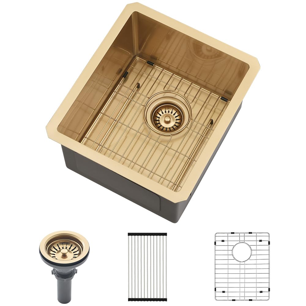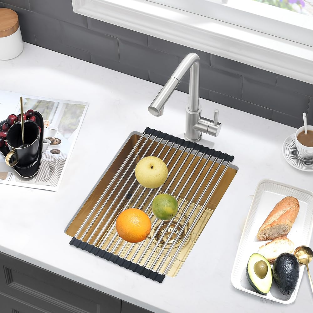- Q: What is included in the package when purchasing the sink? A: The package includes the 13-inch undermount bar sink, a stainless steel bottom grid, a roll-up rack, a 3-piece basket strainer set, a cutout template, and installation instructions.