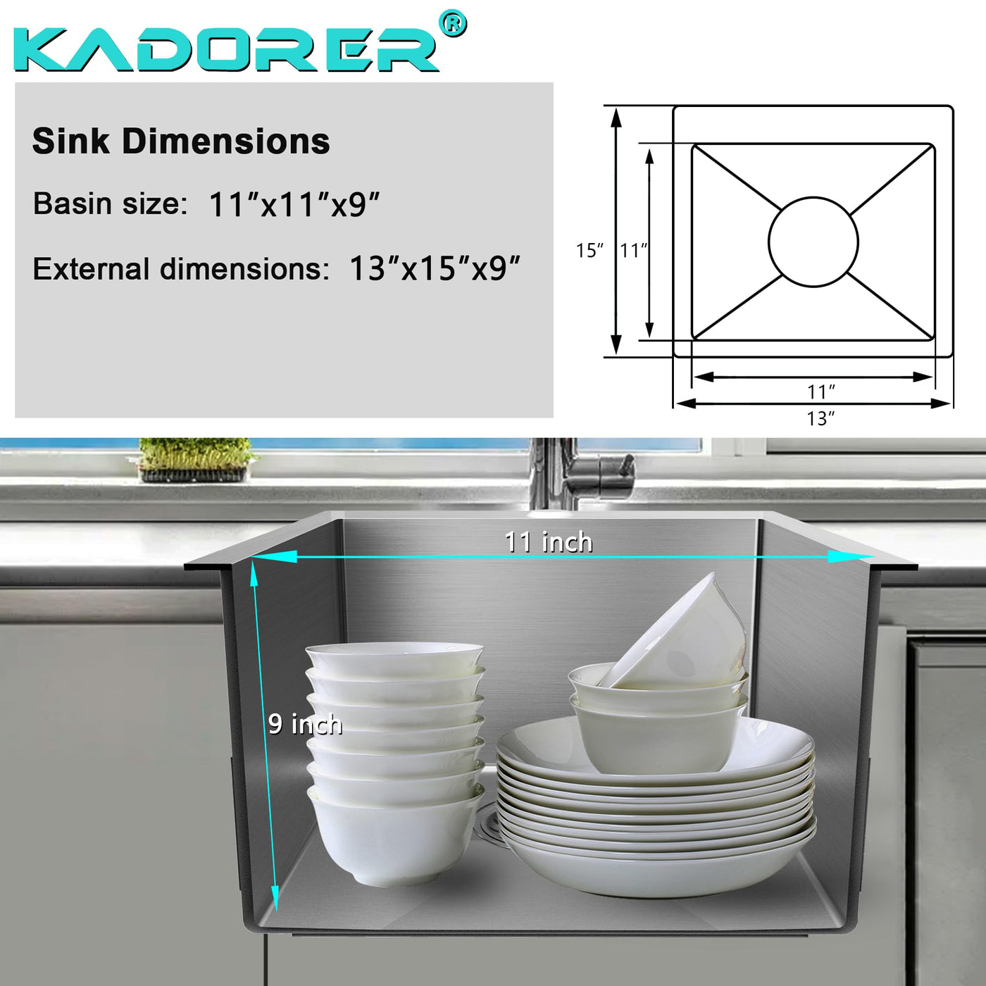 - Q: What are the dimensions of the bar sink? A: The bar sink has internal basin dimensions of 11 inches (L) x 11 inches (W) x 9 inches (D) and external dimensions of 13 inches (L) x 15 inches (W) x 9 inches (D).