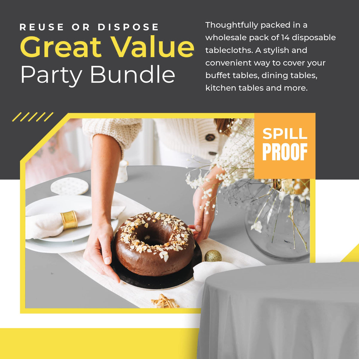 14 Pack Premium Round Silver Plastic Tablecloth - 84 X 84 In. Disposable Round Plastic Table Cloth - Decorative Round Table Cove