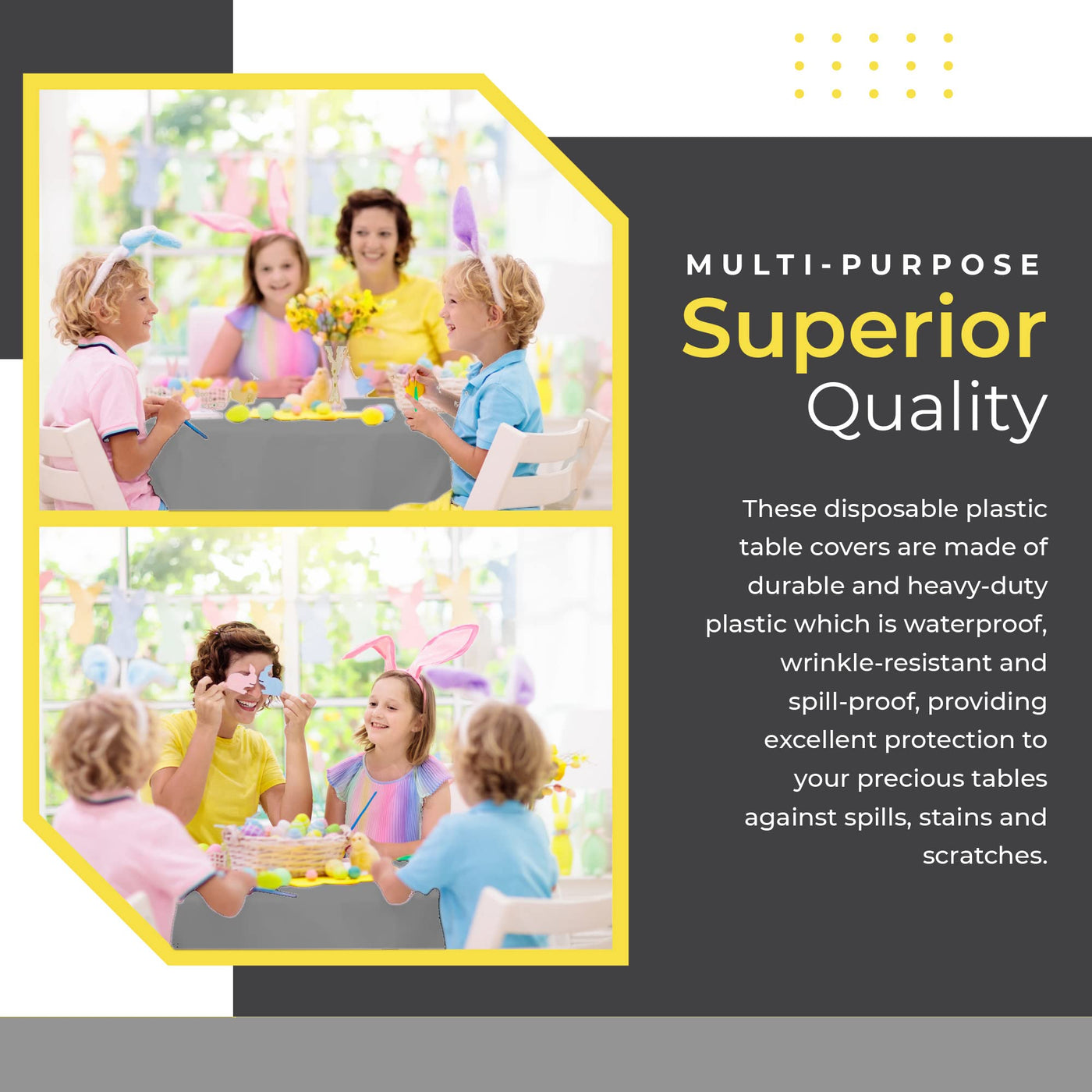 • Q: What material are the tablecloths made from? A: The tablecloths are made from high-quality plastic that is waterproof, wrinkle-resistant, and designed to protect your tables from spills and stains.