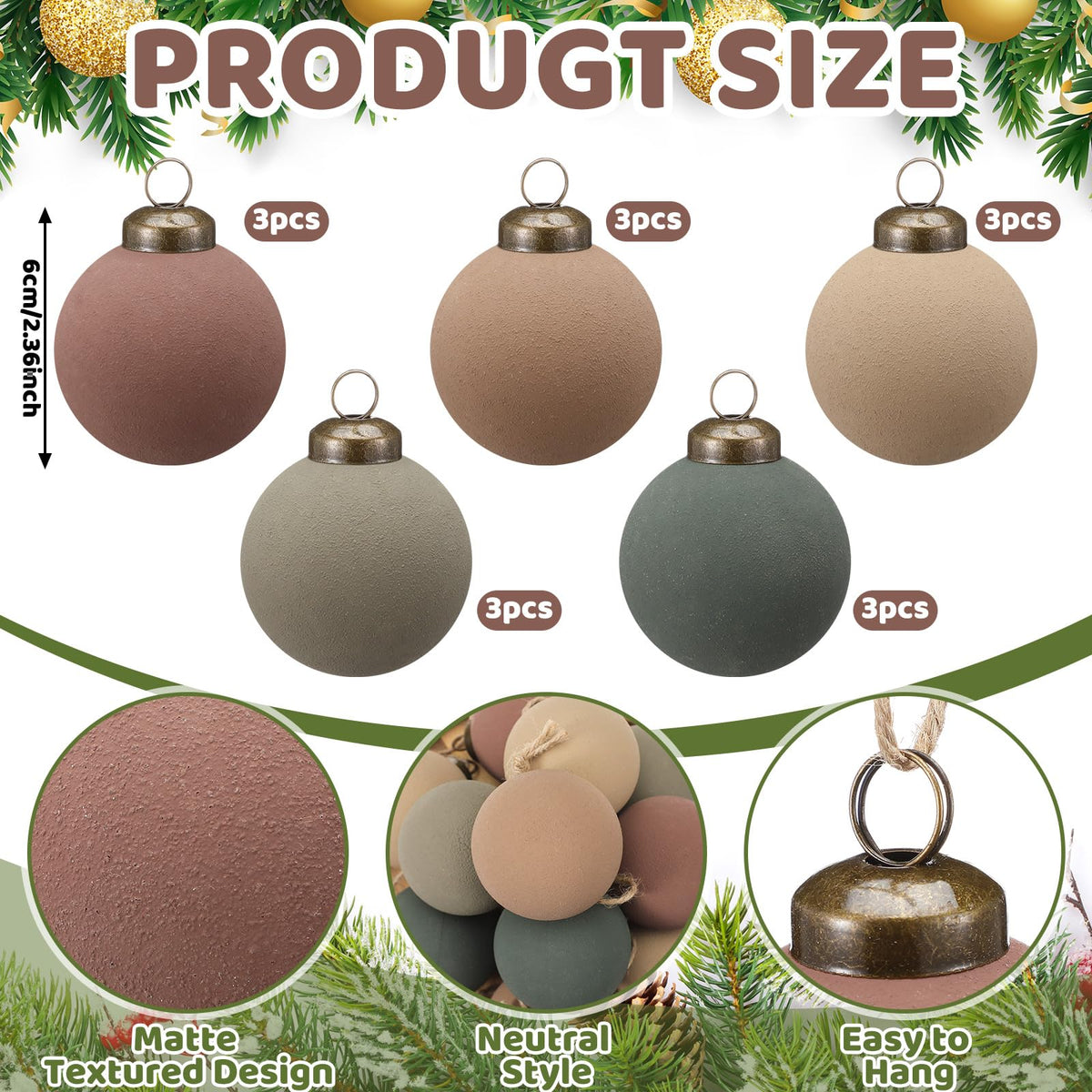 Features: Enhance your holiday decor with our matte textured Christmas ball ornaments, expertly crafted from shatterproof plastic in five neutral tones: bronze, dark green, dark gray, dark brown, light gray. These 6 cm ornaments blend vintage charm with rustic elegance, making them perfect for any holiday setting. They come in a set of 15, featuring sturdy, matte-finished spheres with subtle detailing, adding warmth and a timeless appeal to your tree. Ideal as gifts, these vintage, neutral, and textured ornaments capture nostalgic joy and are perfect for retro enthusiasts. Specifications: Material: plastic Color: multicolored Size: 2.36 inches/ 6 cm Package includes: 15 x Matte textured Christmas ball ornaments Notes: Manual measurement, please allow slight errors on size. The color may exist a slight difference due to different screen displays.