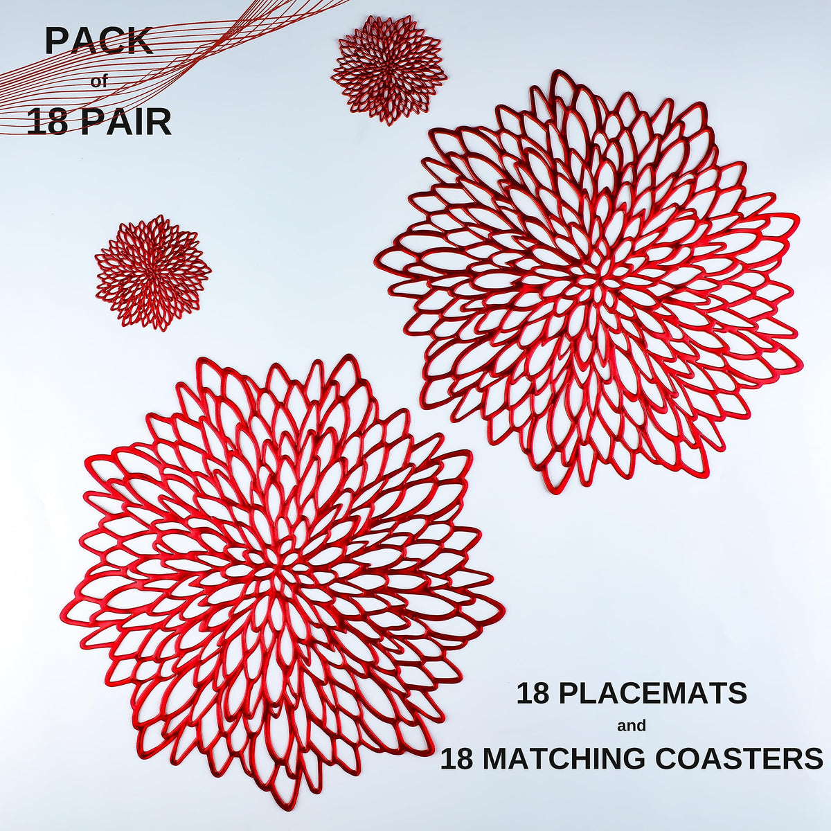 18 Pairs Red Placemats & Coasters 36 Pcs Metallic Shiny Pressed Vinyl Dinning Table Mats Round Leaf Decorative For Christmas Val