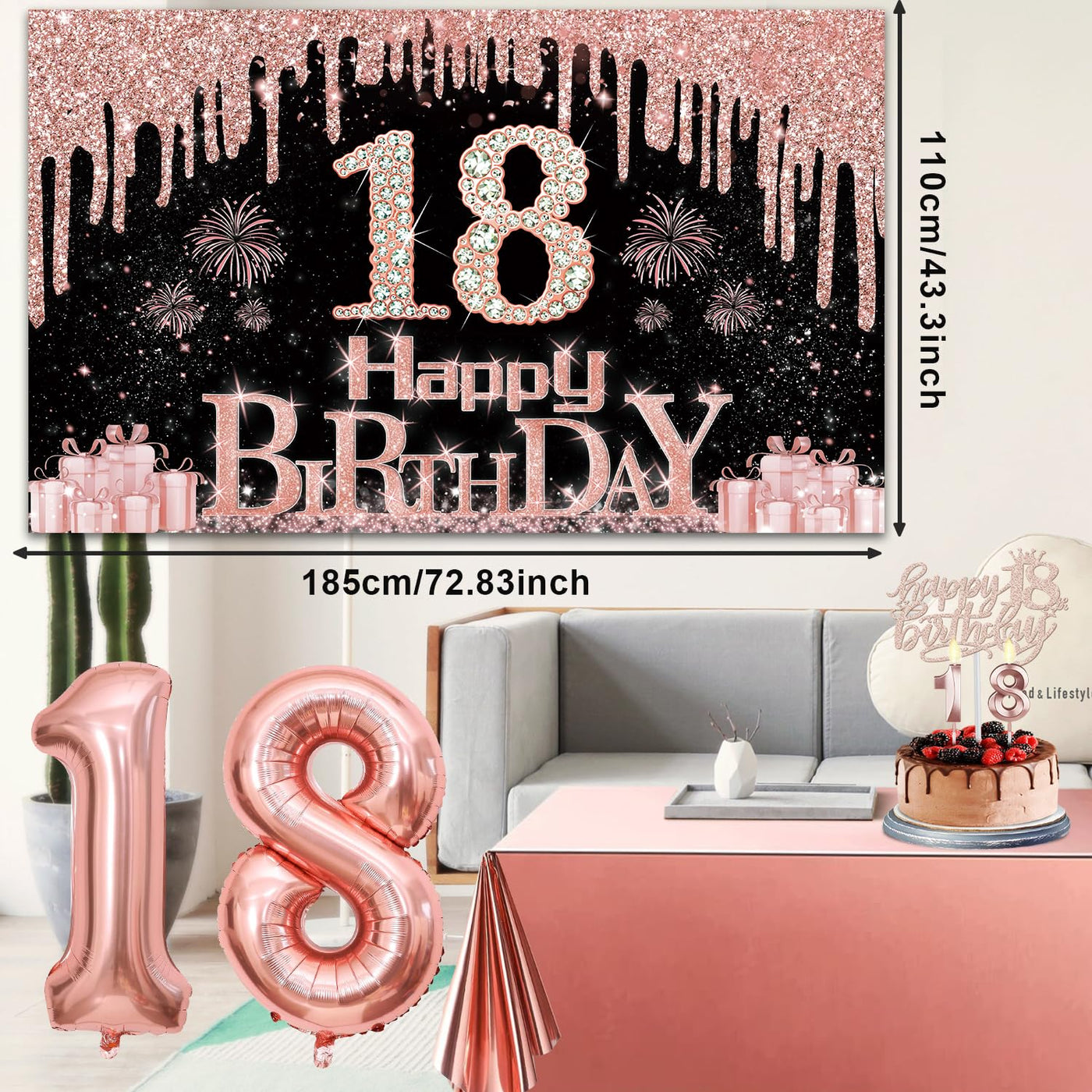 18Th Birthday Decorations For Girls With Banner, Rose Gold Tablecloth, Number Balloons, 18Th Birthday Sash And Tiara, Cake Toppe