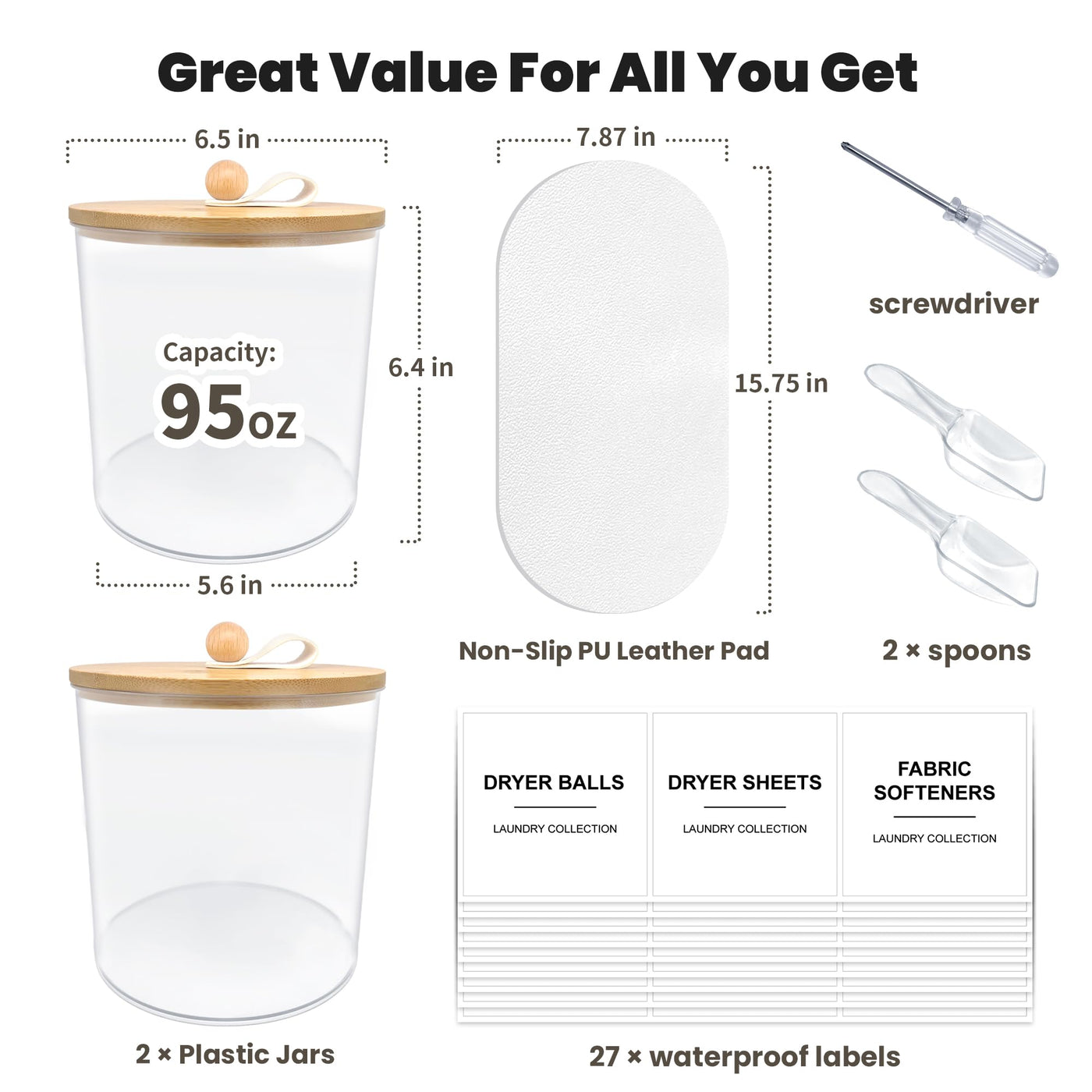 - Q: What is included in the 2 Pack Laundry Pods Container set? A: The set includes 2 large-capacity laundry pod holders, 2 measuring spoons, 23 pre-printed minimalist labels, 4 blank DIY labels, and 1 non-slip mat.