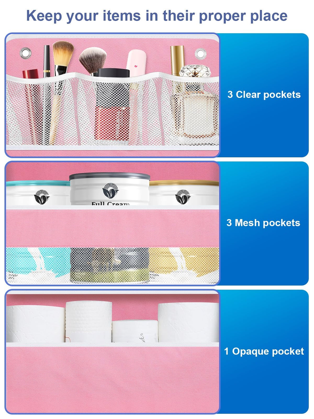 - Q: Can it hold items like cosmetics and toiletries? A: Yes, the organizer can store a variety of items including cosmetics, toiletries, stuffed animals, and other nursery essentials.