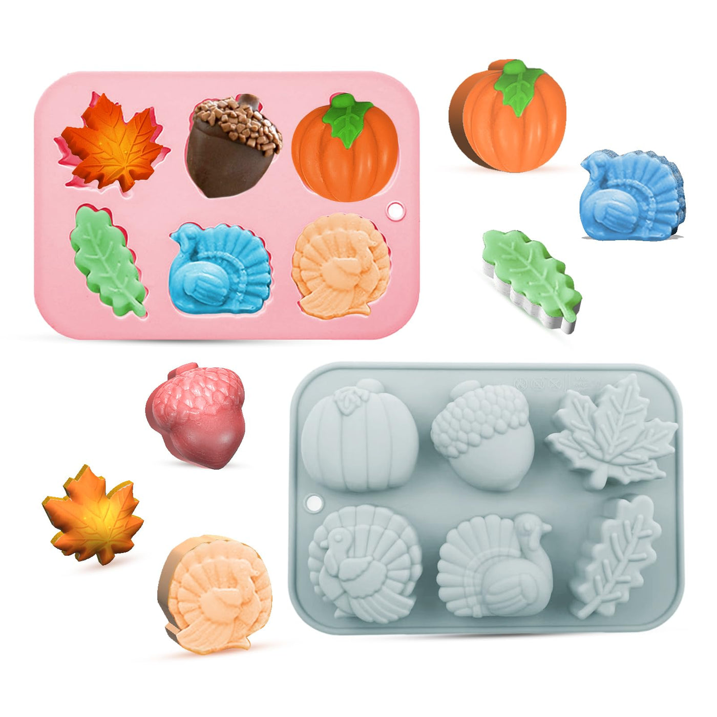 2-Pack Thanksgiving Treat Molds - 6-Cavity Silicone Baking Molds with Turkey, Pumpkin, Pinecone, Maple Leaf - DIY Chocolates, Ca