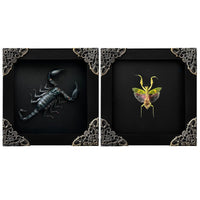 ?FRAMED ART: This listing is for a pack of 2 Real Framed Flower Mantis and Scorpion Taxidermy from Vietnam. We make these handmade shadow boxes with real dried dead beetles and keep them well to retain their shape and color in their natural state. These colorful specimens will bring out the uniqueness of the area where you decorate them and show off your vintage Gothic style. ?FRAME SIZE: 4.7 x 4.7 x 0.8 inch (= 12 x 12 x 2 cm). The frame was made of pine wood covered by 3 layers of paint, with a special acrylic on the front to give a clear view, 4 brass baroque corner protectors in the corner, and a hanger hook on the back and ready to hang. ?UNIQUE GIFT AND DECOR: Our insect collection makes an impressive gift for insect lovers of all ages, your beloved friend, or relatives. A wonderous curiosity is ideal as wall decor for any room you want to brighten up, such as a wall at home, tabletop, desk, or any horizontal surface, gallery d cor, reading room, home interior decoration, bedroom or kitchen, office, class, science, biology, gallery hotel, restaurant, coffee shop, perfect for schools, colleges, or youth club projects. ?PRODUCT CHARACTERISTICS: Please keep in mind that the insects are natural products, so they may have slight scratches or small quirks. The shape and color of the beetles may vary from the pictures since theyre natural. In addition, not all specimens always look exactly the same; therefore, small deviations in the patterns and colors are possible. All insects are prepared by our own entomologists. ?SATISFACTION DELIVERY: Our priority is your happiness. Each of our products will be packed with the loving care of our staff, so it can be delivered in the same condition as you ordered. If you have any problems, please do not hesitate to contact us, and we will do everything to serve you.