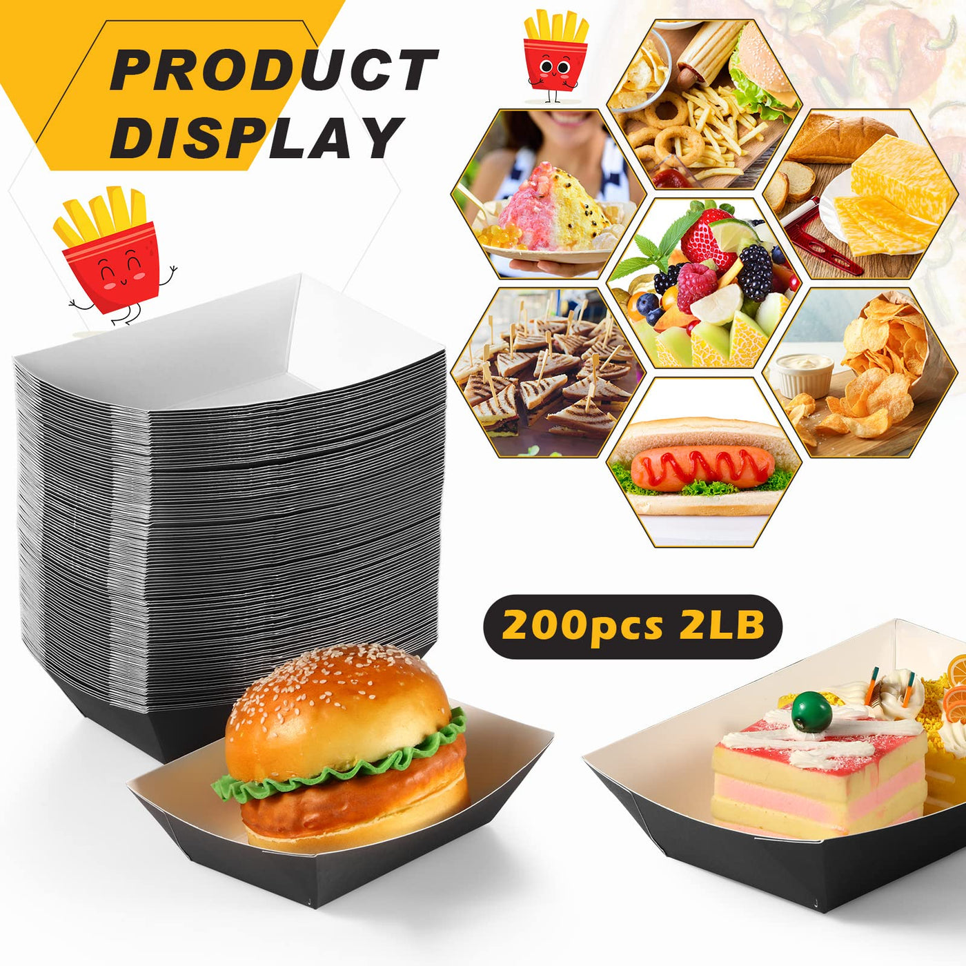 - Q: What types of food can I serve in these paper trays? A: These trays are versatile and can hold various fast foods, snacks, tacos, nachos, candies, cookies, cupcakes, hot dogs, popcorn, hamburgers, french fries, and more.