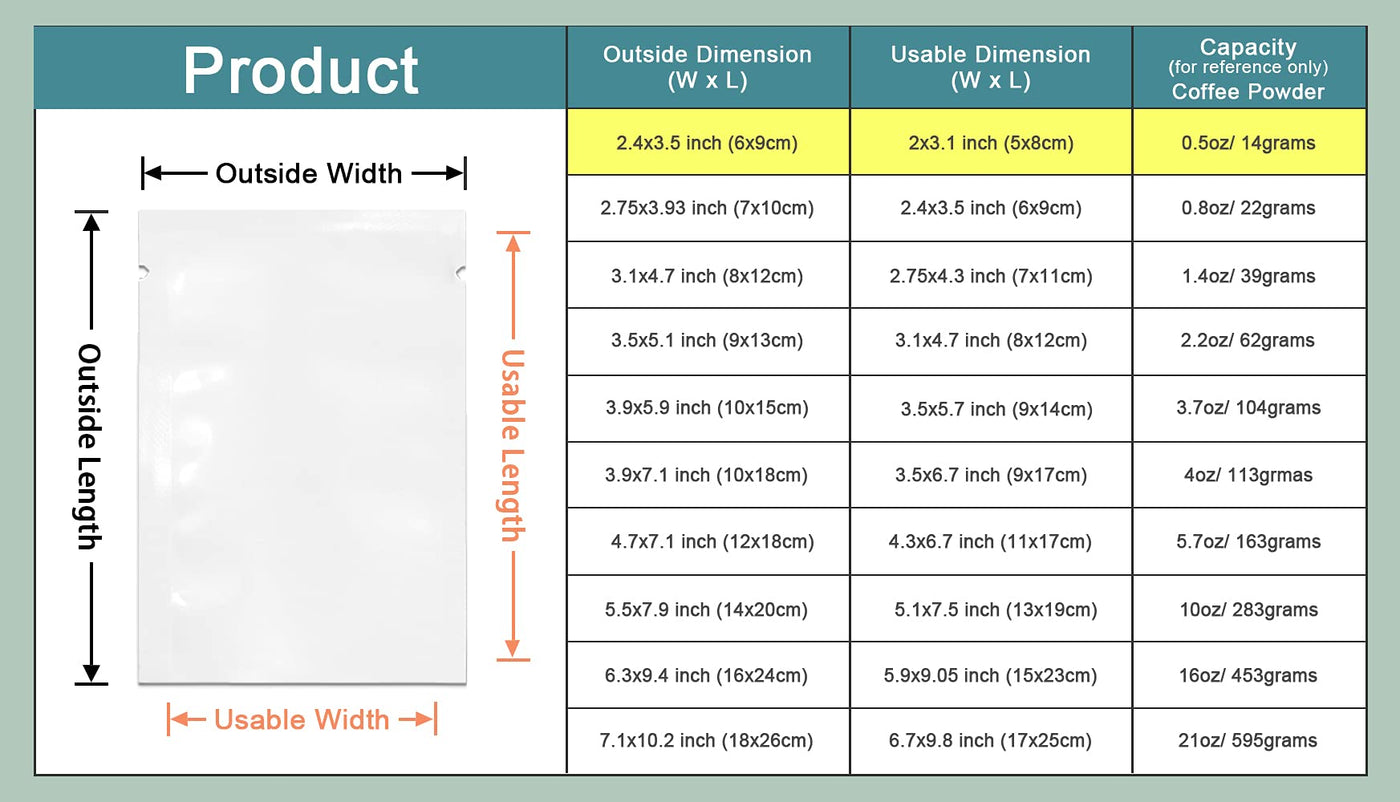 - Q: What are the dimensions of the vacuum pouch? A: The vacuum pouch has dimensions of 2.4 inches by 3.5 inches, with a usable size of 2 inches by 3.1 inches.