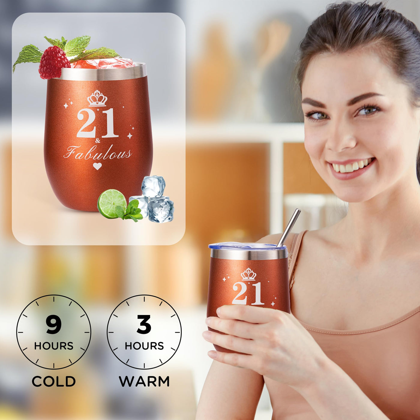 - Q: What items are included in the 21st birthday gift basket? A: The 21st birthday gift basket includes a 12-ounce insulated stainless steel wine tumbler, a bath bomb, a makeup bag, fuzzy socks, a mirror, soy wax flower scented candles, a keychain, a greeting card for your blessings, and a gift box.