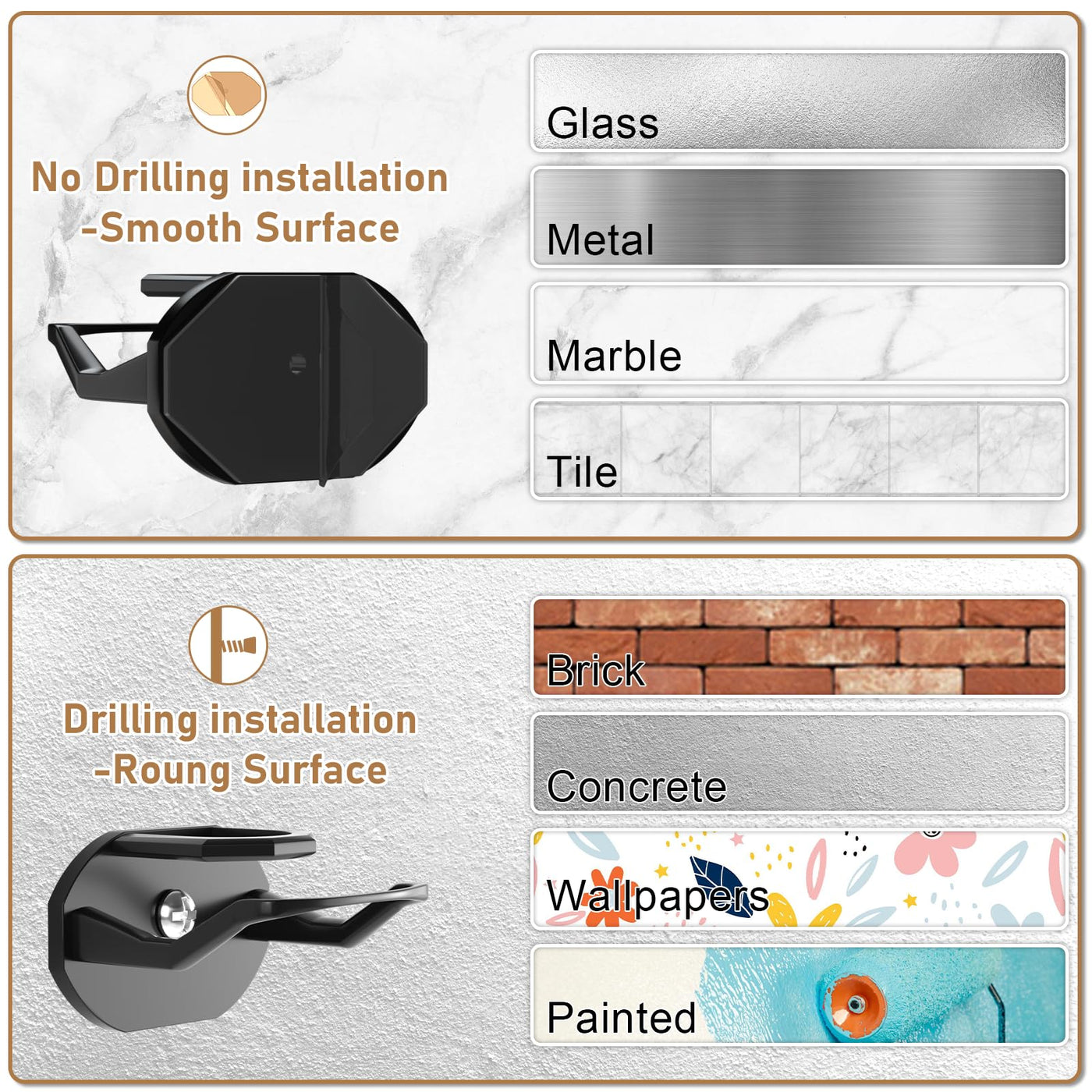 - Q: Can the hooks be used on any surface? A: The hooks work best on flat and smooth surfaces such as wood, tile, metal, glass, and marble. Avoid using them on wallpaper or painted walls to prevent damage.