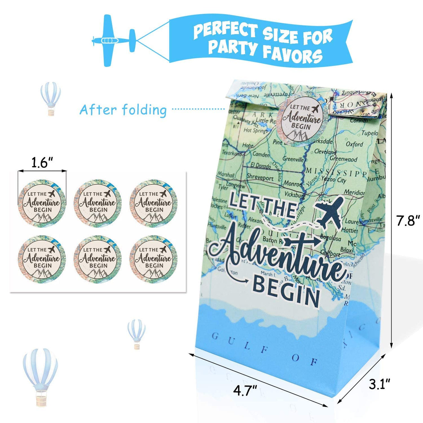 - Q: What occasions are these favor bags suitable for? A: These bags are perfect for adventure-themed parties, travel-themed birthdays, baby showers, bridal showers, and farewell parties.