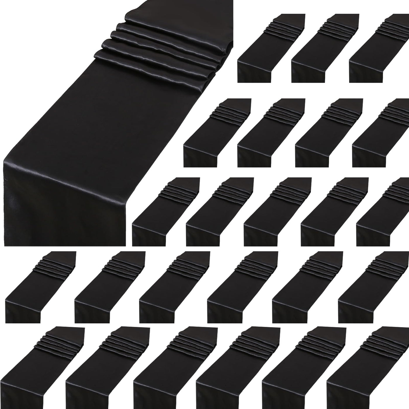 • Q: How many table runners are included in the pack? A: The pack includes 24 pieces of black satin table runners.