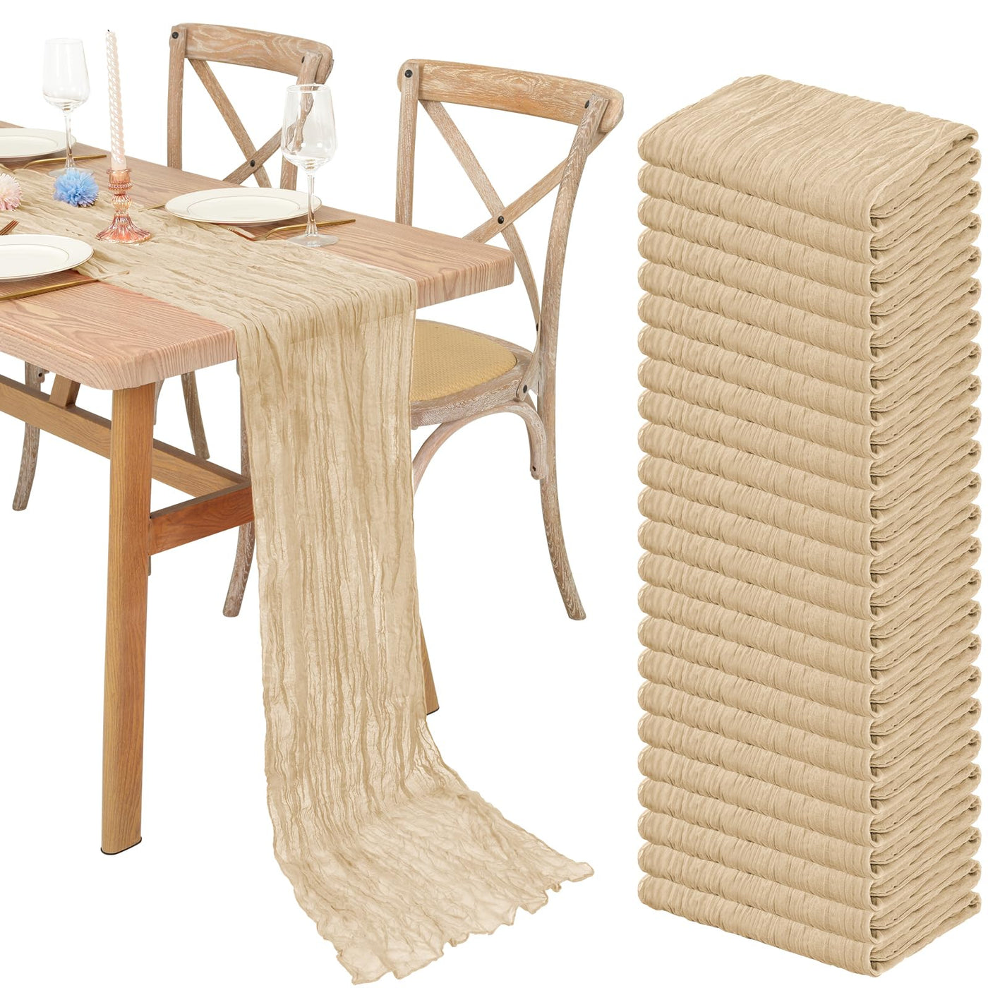 - Q: What are the dimensions of the cheesecloth table runner? A: Each cheesecloth table runner measures 21.5 inches wide and 120 inches long, making it suitable for round or square tables that can accommodate 8-10 people.