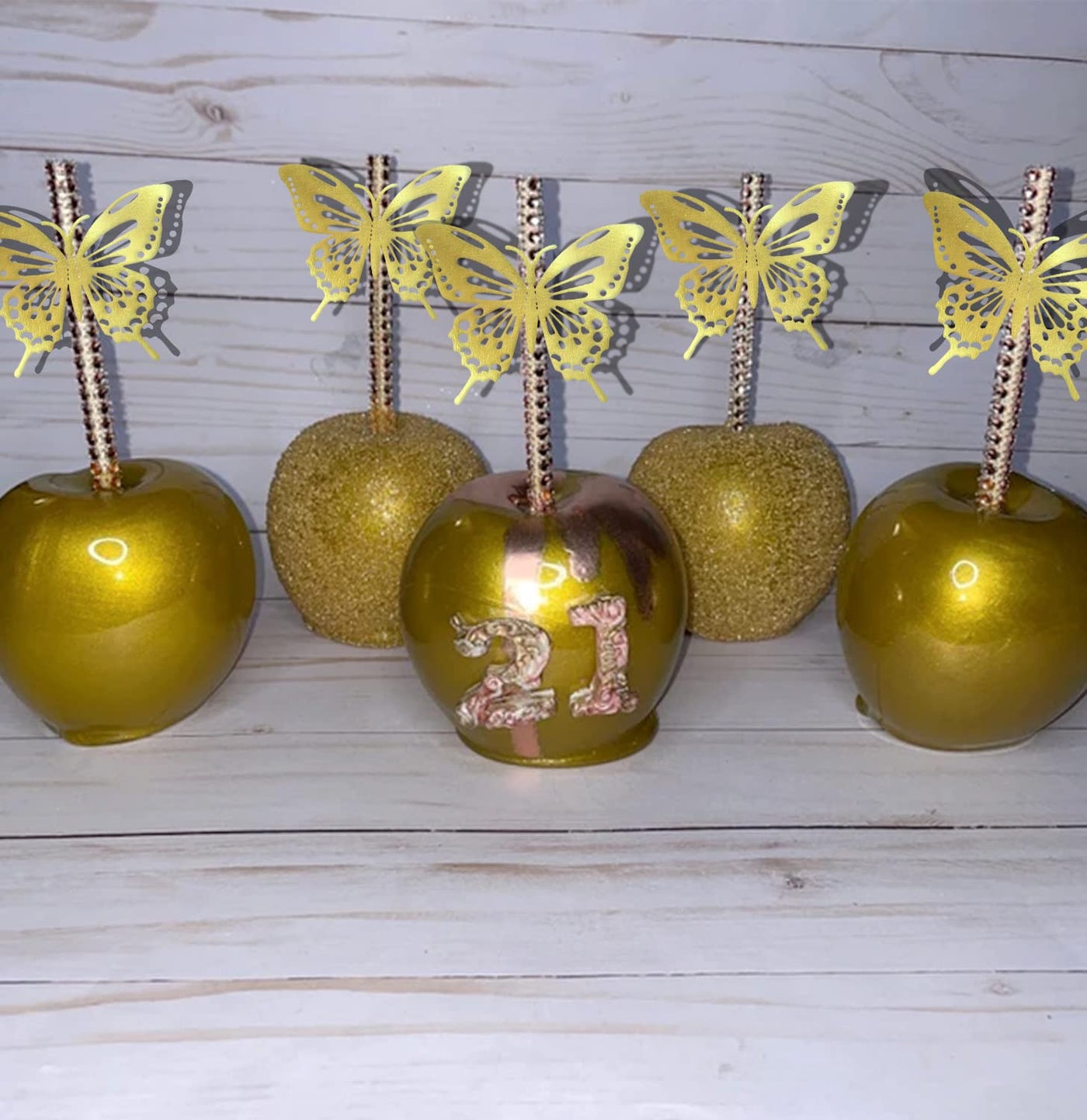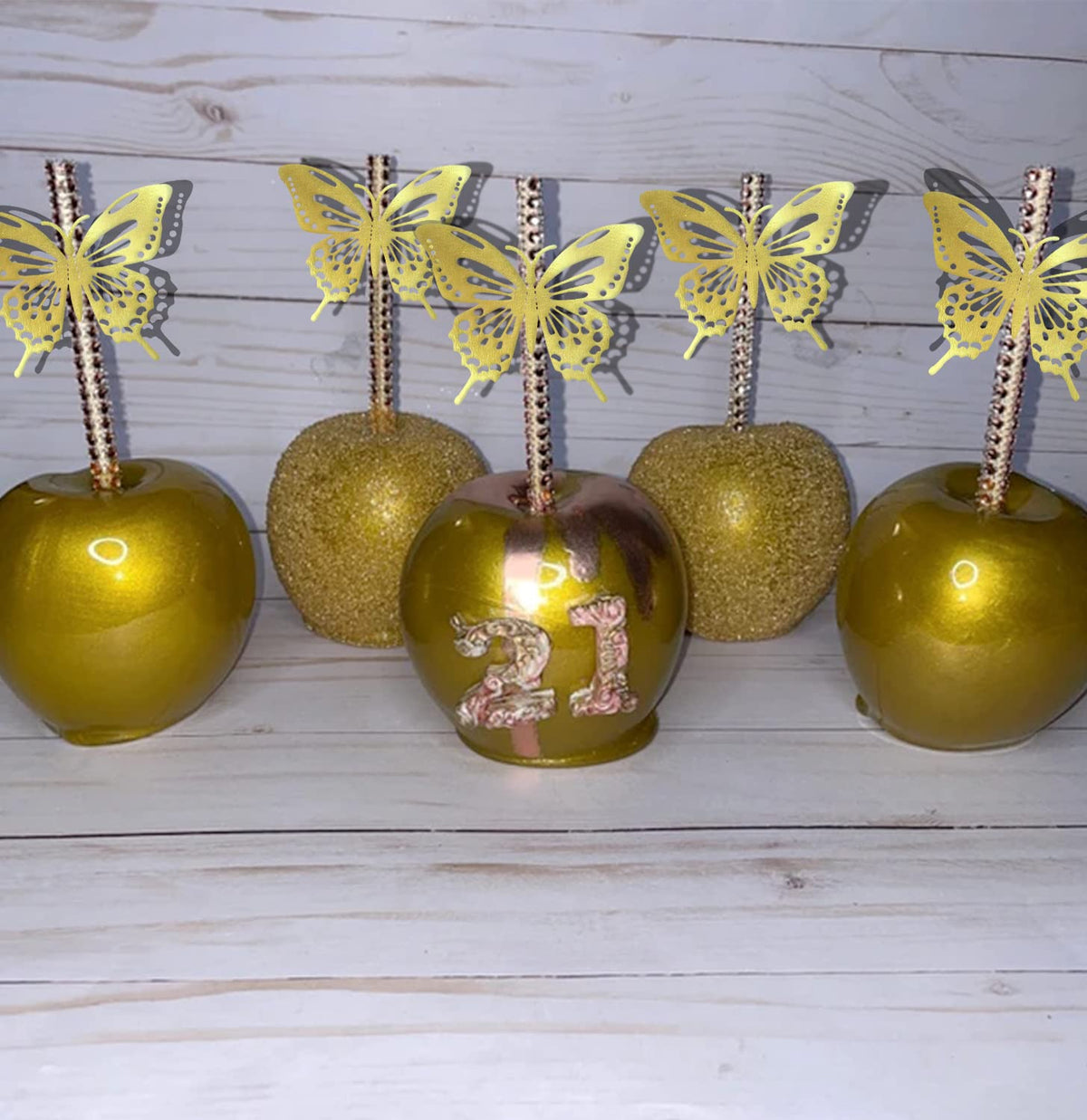 - Q: How do I attach the butterfly stickers to the sticks? A: You can fold the butterfly stickers into your desired shape and attach them to the candy apple sticks using the included tape.
