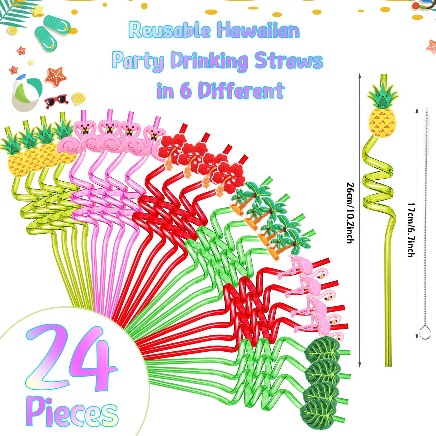 24 Pcs Hawaiian Reusable Plastic Straws With 2 Cleaning Brush Luau Theme Straws Flamingo Drinking Straws Aloha Party Favors For