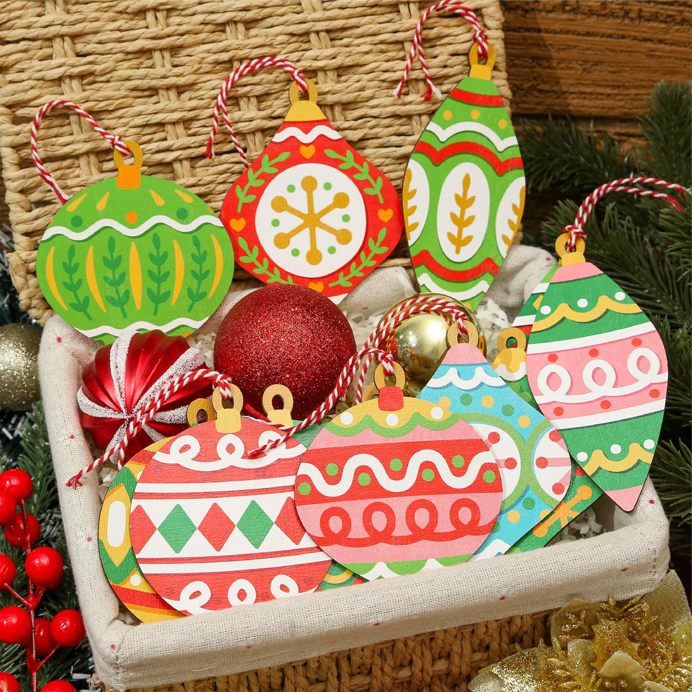 24 PCS Wooden Christmas Ornaments, 12 Styles Printed Christmas Tree Hanging Ornaments with Strings, Holiday Party Favors, Gift T