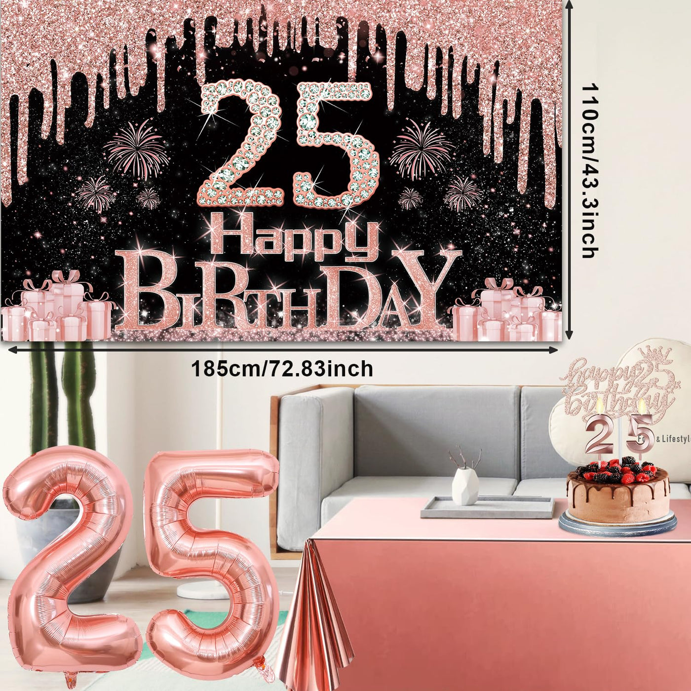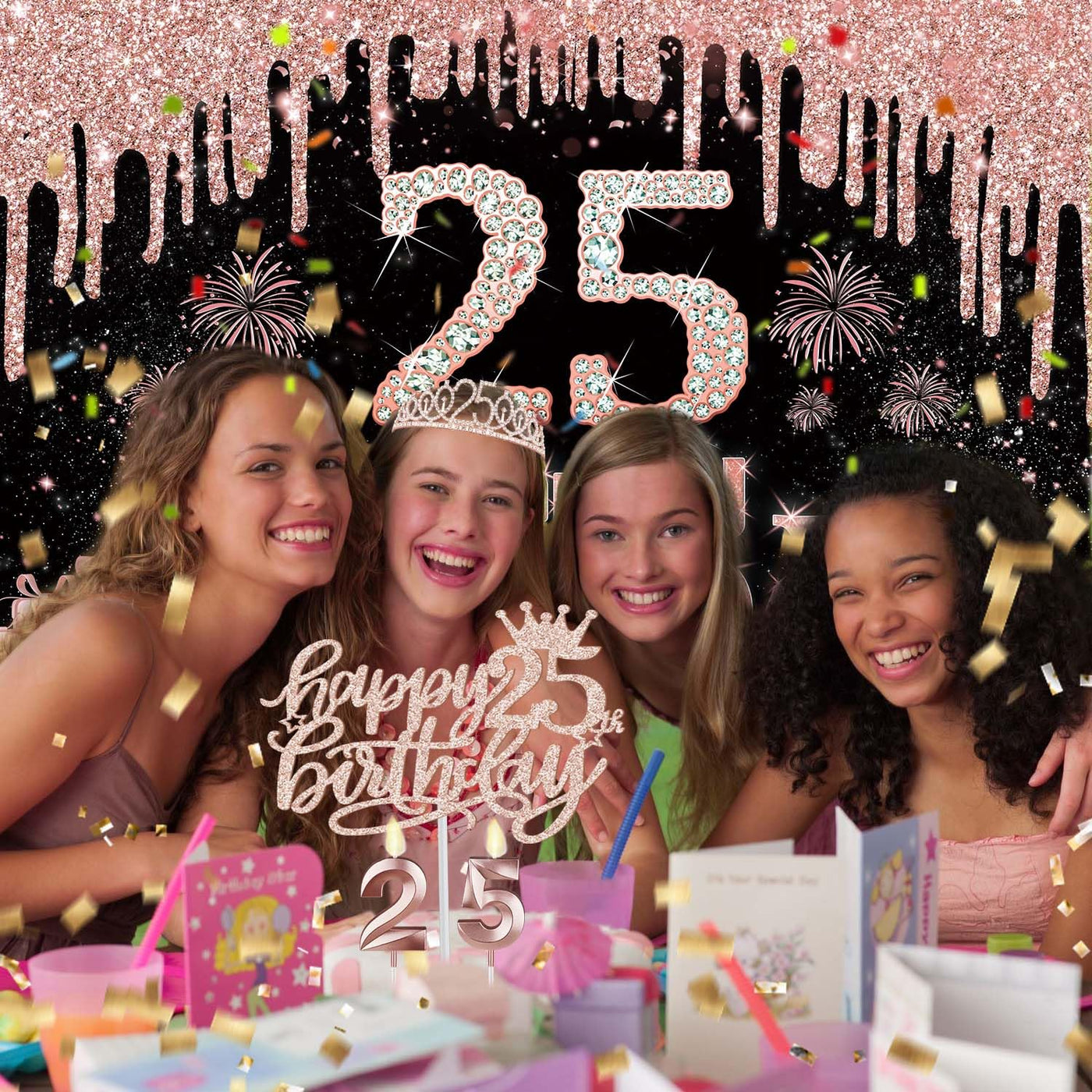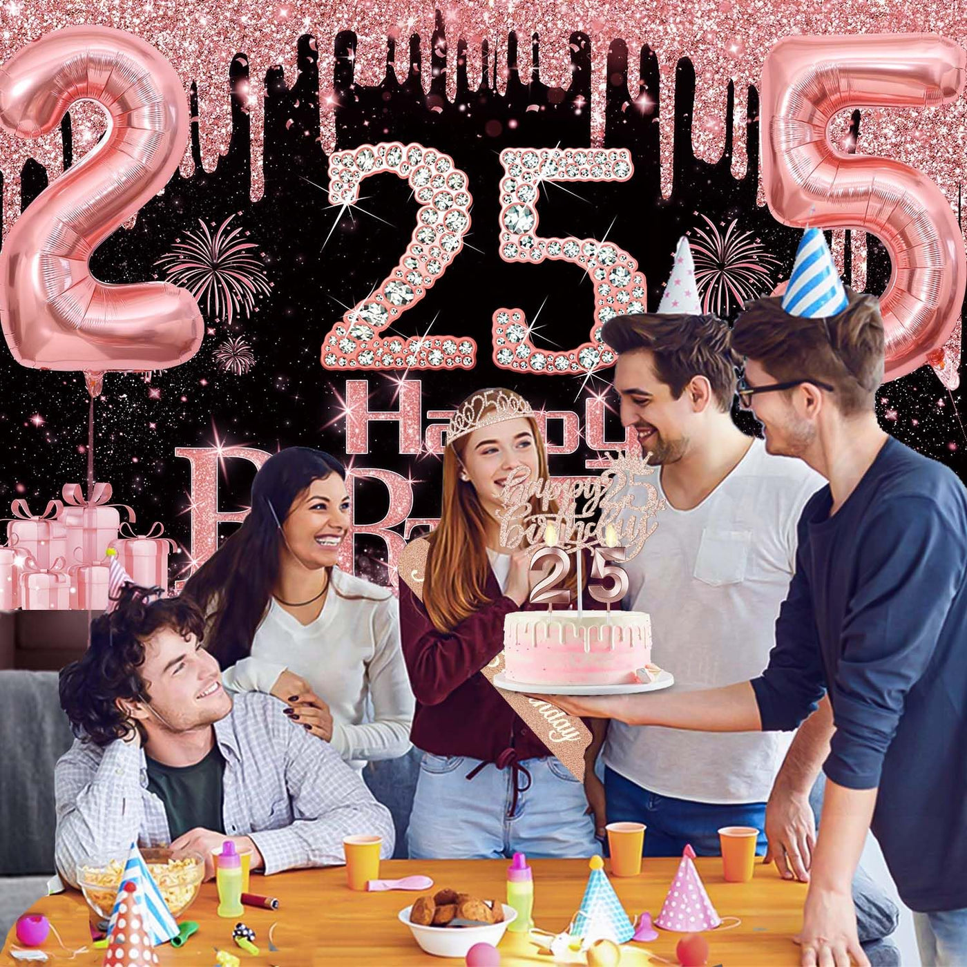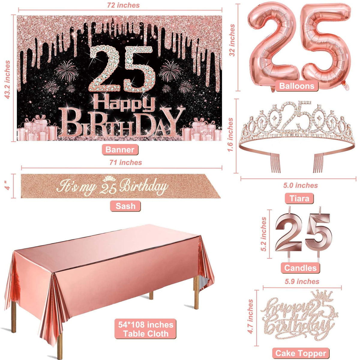 - Q: What items are included in the 25th birthday decoration pack? A: The pack includes a 25th Birthday Banner, a Tiara, a Sash, a Happy 25th Birthday Cake Topper, a set of Birthday Candles, a set of Birthday Balloons, and a Rose Gold Tablecloth.