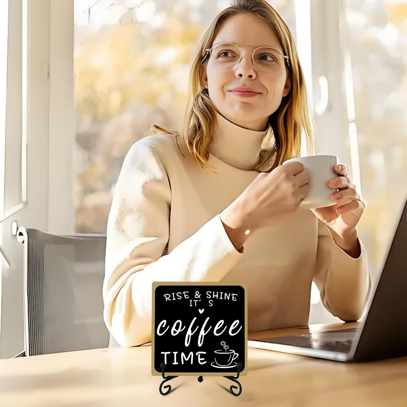 2Pcs Coffee Bar Sign Decorations, Black and White Coffee Sign Decor with Iron Stand Wooden Coffee Bar Decor Tabletop Shelf Acces