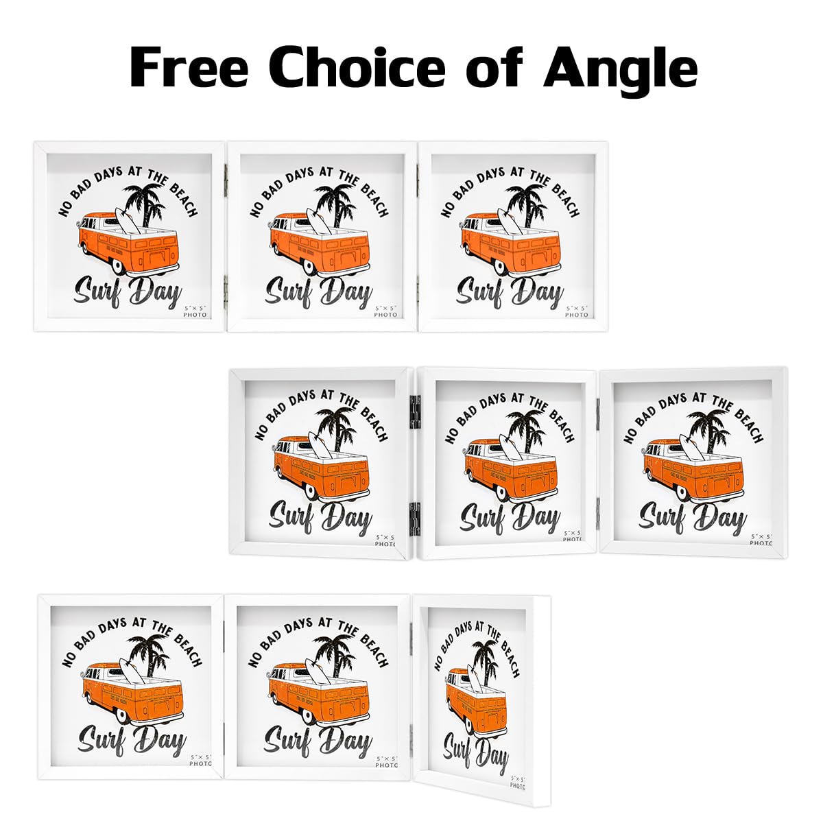 3 Picture Frame 5x5 White Triple Hinged MDF Wood with Glass Front Three Opening Photo Frame Stand Vertical on Tabletop