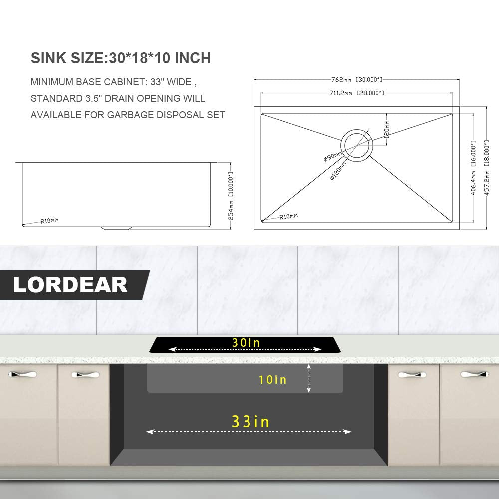 - Q: What are the dimensions of the Lordear 30 Kitchen Sink Undermount? A: The Lordear 30 Kitchen Sink Undermount has dimensions of 30 inches in length, 18 inches in width, and a depth of 10 inches.