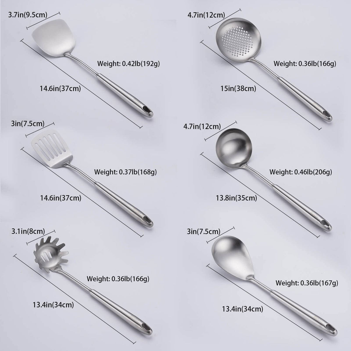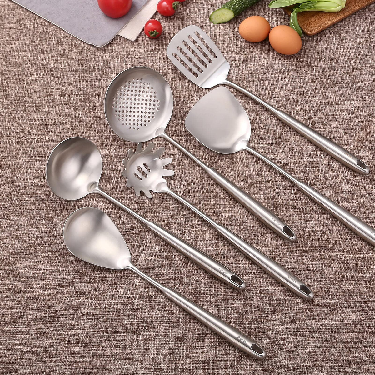 - Q: What utensils are included in the set? A: The set includes a spatula, a soup ladle, a skimmer slotted spoon, a slotted spatula tuner, a serving large spoon, and a spaghetti spoon.